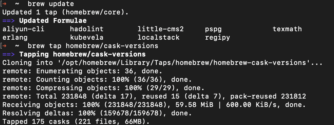 먼저 HomeBrew를 업데이트 합니다. 추가로 cask를 사용하기 위해 casks tap 명령어를 진행합니다.