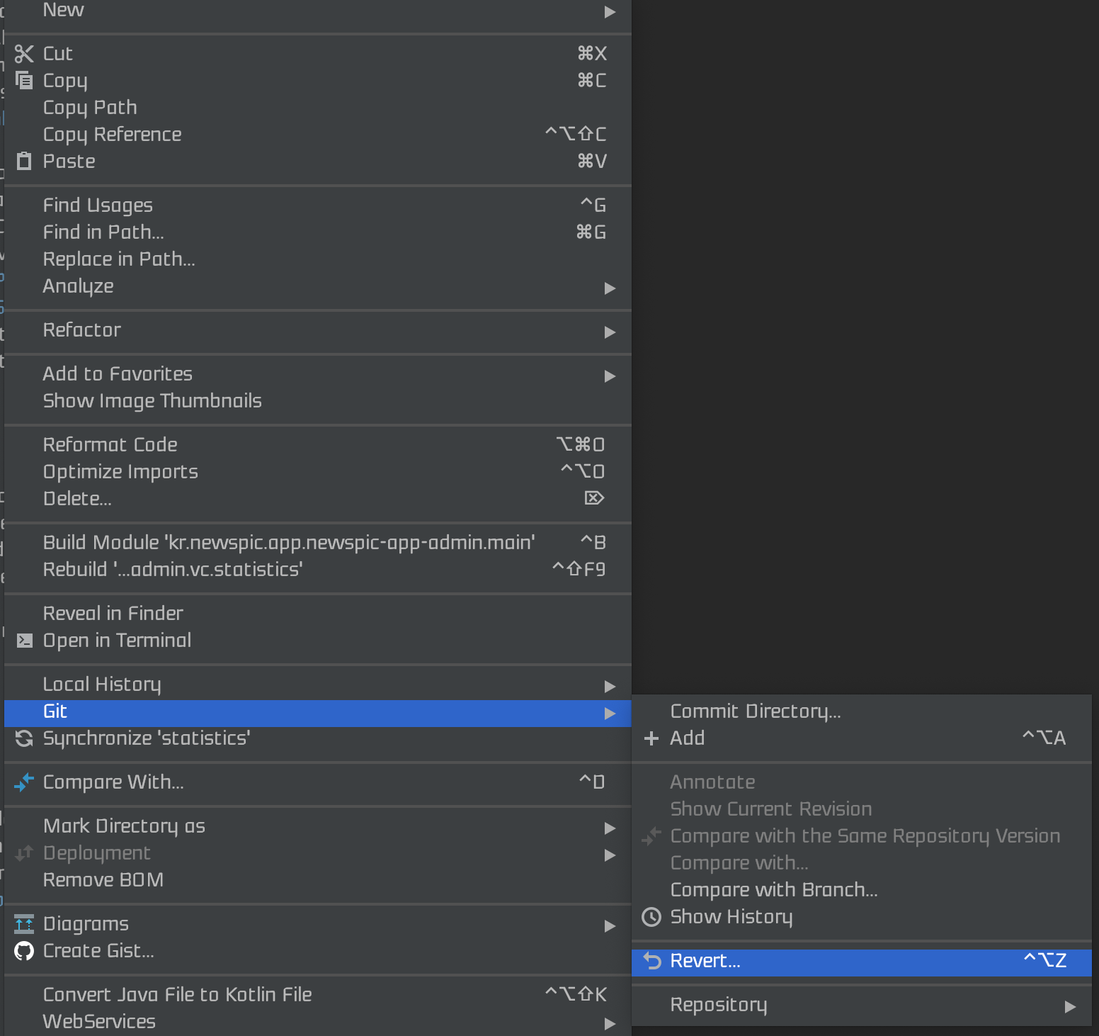 revert: 기존에 커밋하였던 내역을 삭제하고 HEAD로 소스를 되돌린다. 또, 여기서 git add된 파일들은 커밋하기 전의 상태로 되돌아가기 때문에 IntelliJ에서는 빨간색으로 출력된다. 마치 파일을 추가하고 add를 하기 전과 같다.