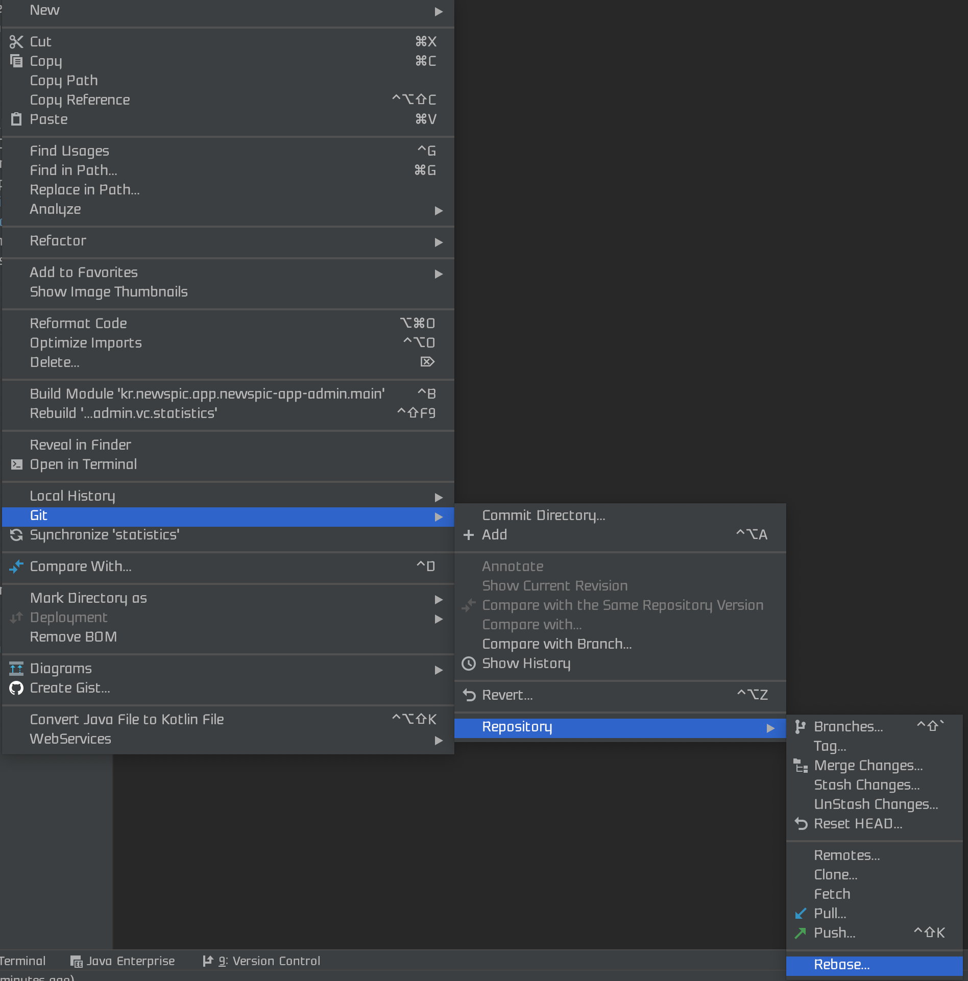 rebase: 내가 작성한 소스가 HEAD 위로 올라가는 것은 merge와 같지만, commit 이력이 최근 push 시점 이후로 갱신된다는 것이 merge와의 차이이다.
