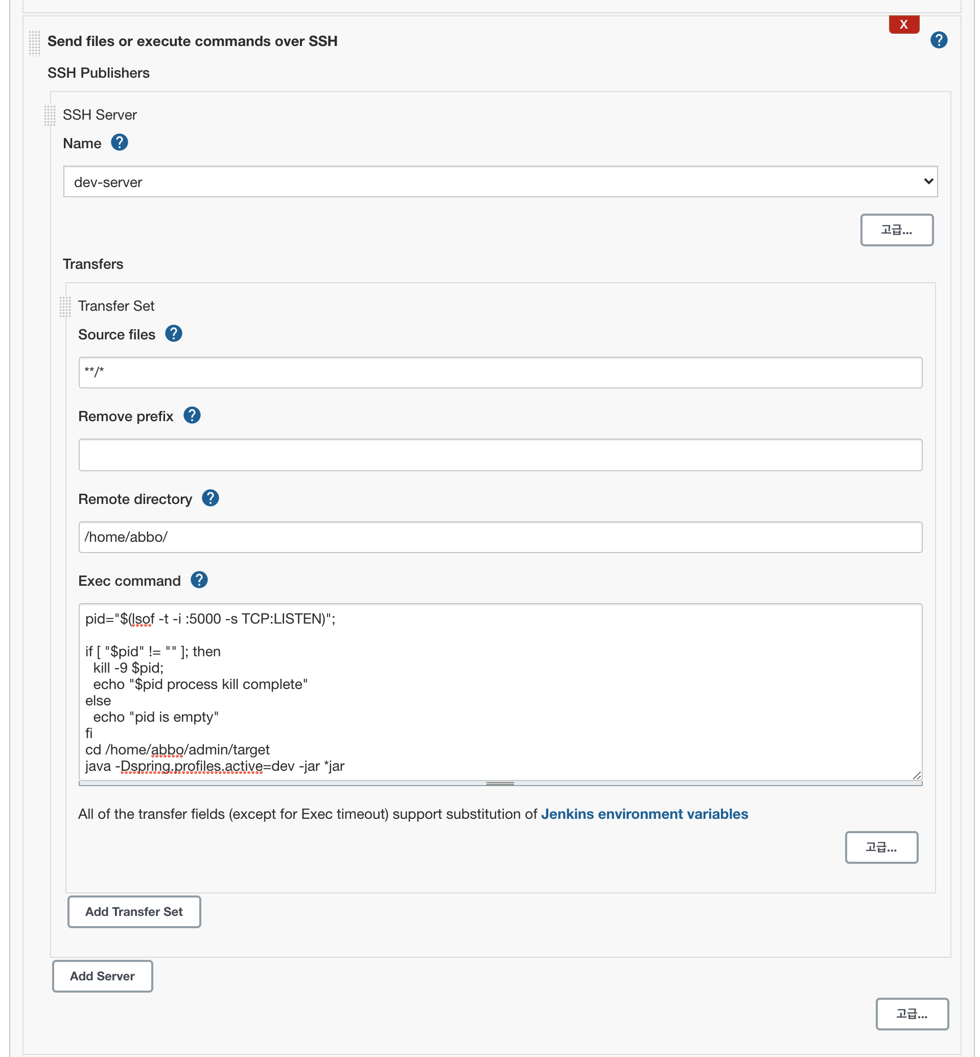젠킨스에서 다른 서버에 접속하여 파일 전송을 하는 것까지 마쳤다면 이제 그 파일들을 재기동시키기 위한 작업을 하는 과정입니다.