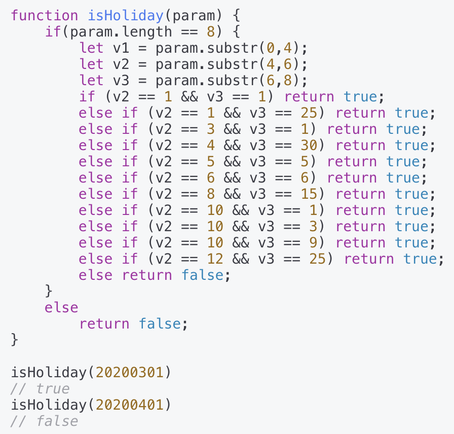 아래의 소스는 2020년 기준으로 우리 나라의 법정 공휴일을 계산한 소스코드이다.