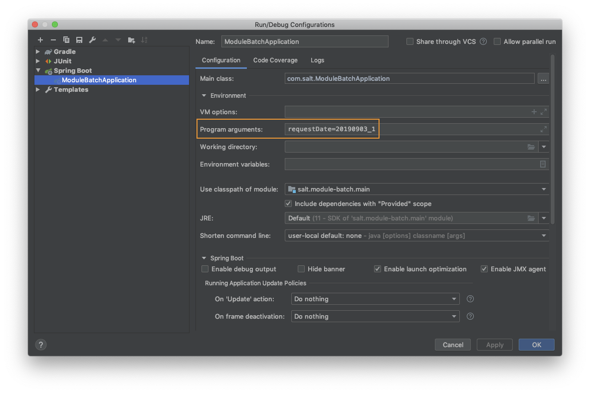 Run/Debug Configurations를 열어 Program arguments의 값을 requestDate=20190903_1 로 입력 후 OK버튼을 누릅니다.