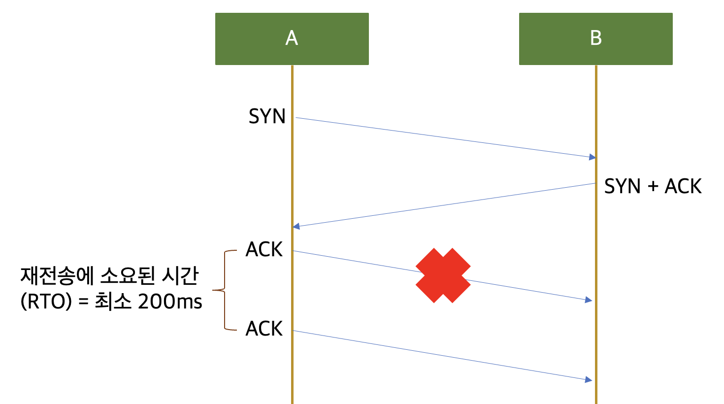 ACK 패킷 유실의 경우는 앞의 두 경우와는 조금 다른데 왜냐하면 SYN과 SYN+ACK 패킷을 서로 주고 받으면서 A와 B는 이제 둘 사이의 RTT를 알게 되었습니다. ACK 패킷 부터는 InitRTO의 적용을 받지 않고 RTT를 기반으로 계산된 RTO의 적용을 받습니다. 그리고 RTO의 기본값은 RTT를 기반으로 계산된 복잡한 값 혹은 이 값이 200 ms 보다 작다면 200 ms가 적용 됩니다. 따라서 ACK의 유실에 의한 재전송은 최소 200 ms 가 소요 됩니다. 대부분의 경우 1초를 넘기지는 않을 겁니다.