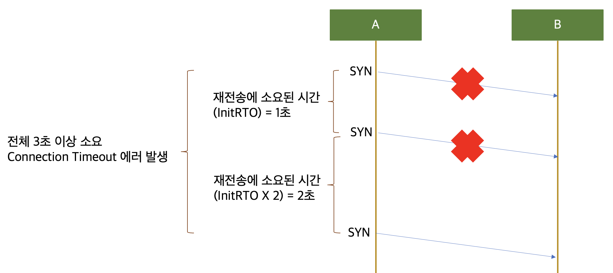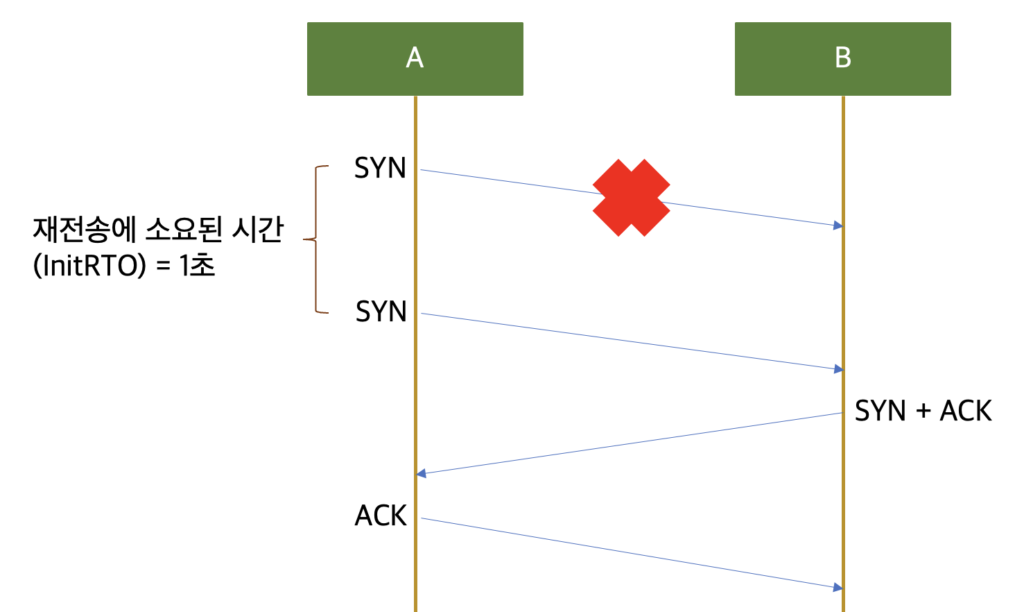 A가 B와 연결을 맺기 위해 보낸 SYN 패킷이 유실 되었다고 가정해 보겠습니다. A는 B로부터 SYN+ACK를 받을 준비를 하고 있는데 SYN 패킷이 유실되어 B에게 도착하지 않았기 때문에 B는 SYN+ACK를 보낼 수 없습니다. 따라서 A는 자신이 보낸 SYN 패킷이 유실되었다고 판단하고 다시 보내게 됩니다. 그리고 이 때 사용되는 재전송을 판단하기 위한 타임아웃을 InitRTO 라고 부릅니다. 패킷의 유실 여부를 판단하는 타임아웃 값을 RTO라고 부르는 데 RTO는 두 종단 간의 RTT (Rount Trip Time)을 기준으로 생성 됩니다. 즉 패킷이 두 종단 간을 흘러가는 데 필요한 최소한의 물리적인 시간이 필요하기 때문에 그 값을 기반으로 RTO를 계산해 냅니다. 두 종간 간에 패킷이 흐르는 데 100ms가 필요하다면, 보내는데 100ms 받는데 100ms 합쳐서 최소한 200ms 가 소요되기 때문에 200ms 이상은 기다려야 패킷이 유실되었는지 여부를 알 수 있습니다. 하지만 방금 본 예제처럼 연결을 최초에 맺는 경우에는 종단 간 RTT 값을 알 수 없기 때문에 무조건 이만큼은 기다려보자 라는 설정 값이 필요하고 이 값이 바로 InitRTO 입니다. 그리고 이 값은 리눅스 상에서는 1초로 하드코딩 되어 있습니다. 따라서 SYN 패킷이 한 번 유실된다면 최소한 연결을 맺는데 1초 이상의 시간이 소요 됩니다.