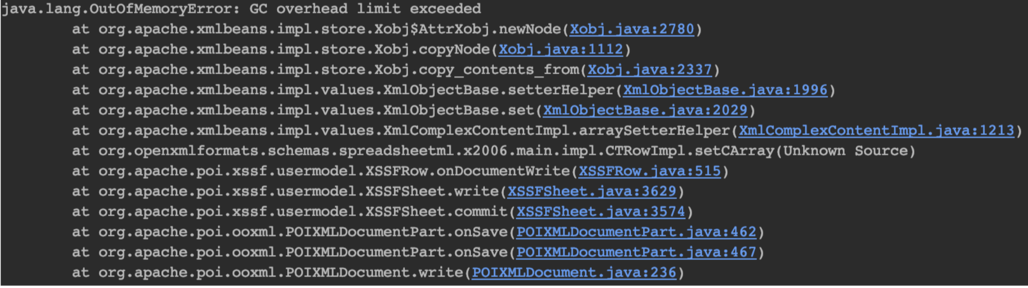 건수가 많지 않으면 위의 로직을 사용해도 전혀 무방하다. 5만 row까지는 괜찮은데, 이게 하다보면 다음과 같이 에러가 떨어진다.