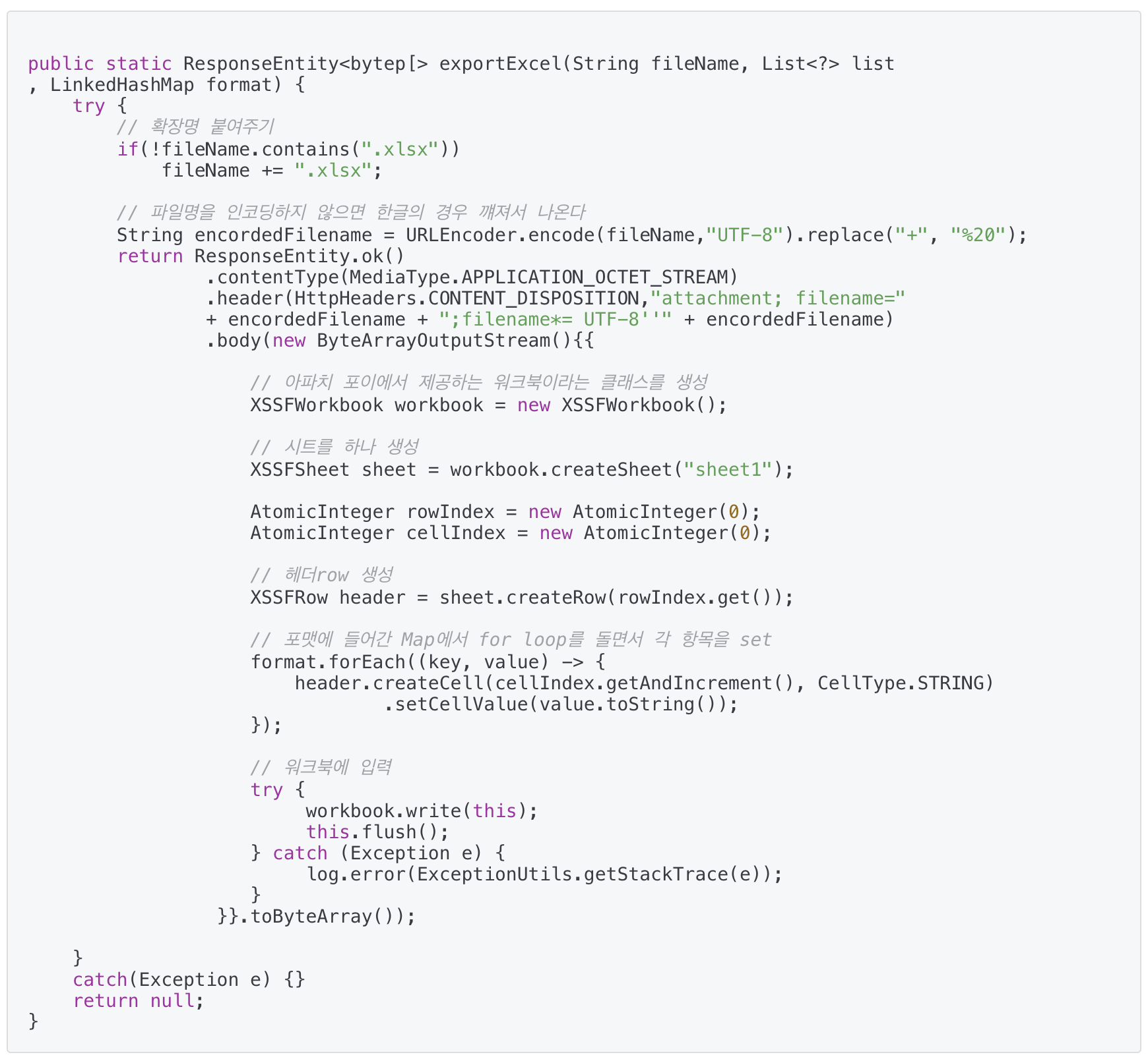이를 해결하기 위해서 엑셀변환이 아닌 csv 포맷으로 변환하는 것을 대책으로 결정이 났다. csv 파일은 excel로의 변환 과정이 없는 plain text를 그대로 출력하기 때문에 속도면에서나 쓰기면에서 빠른 것으로 알고 있다. 접목시켜본 결과 로직은 훨씬 심플하고 별다른 주입이 필요없이 개발이 진행되었다.