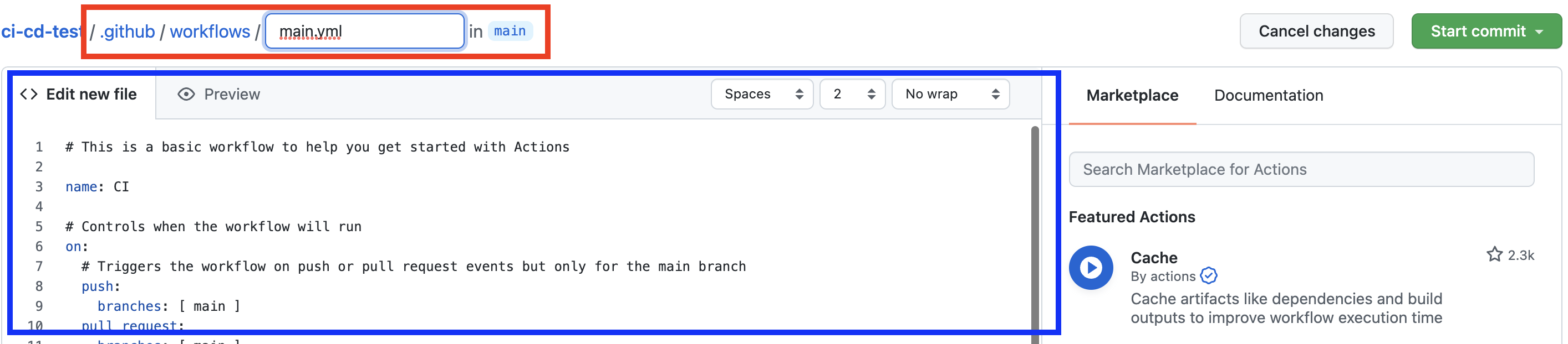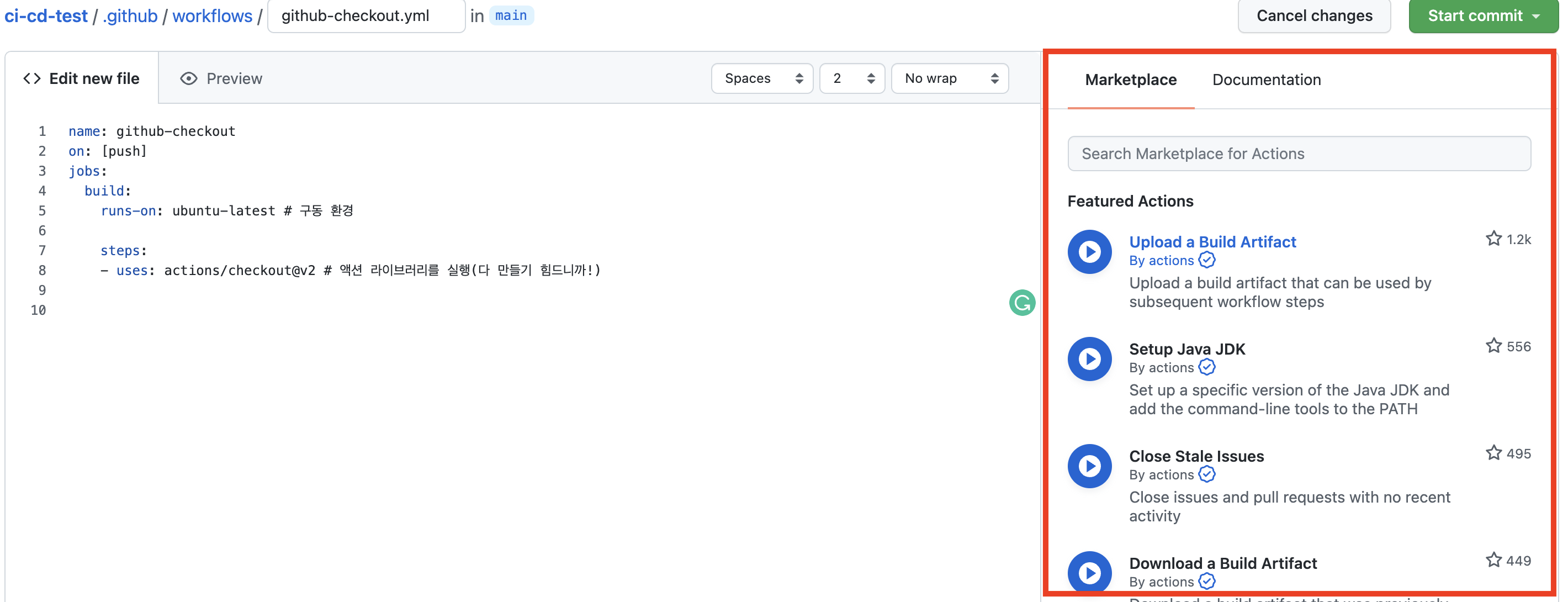 - 원래라면 workflow에 코드를 작성해야하지만 예시 코드를 그대로 두고, start commit을 눌러보면