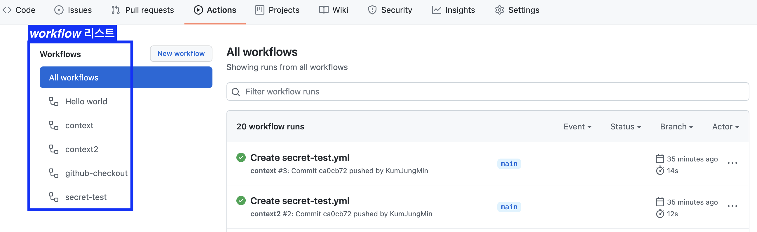- Actions 탭의 좌측을 보면 workflow 리스트가 존재하며, 우측에 커밋 메시지와 초록불이 보임