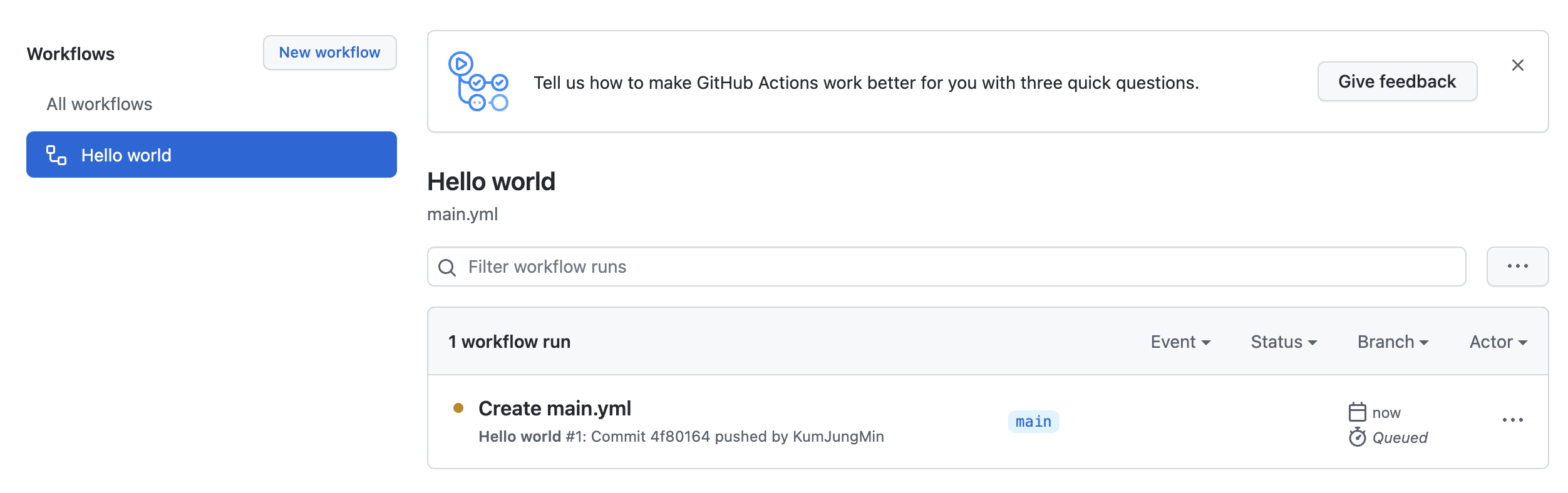 name: Hello world # 1. 이 워크플로우의 이름은 Hello world야