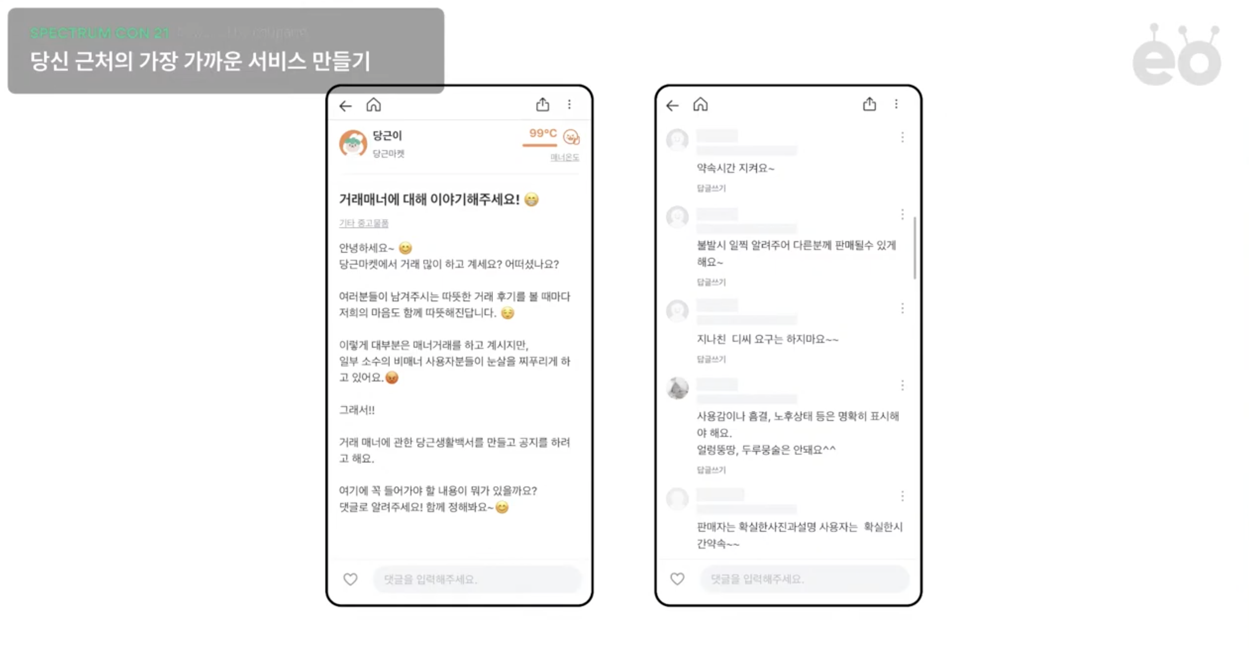 현재 당근마켓은 서울시 관악구부터 시작하여 어떤 브랜드파워를 갖추고 있는지 실험을 하고 있고, 그에 맞춰서 UX 디자인과 현재의 성장 가능성 및 해외 출시를 할 때 어떤 생각을 하는 지에 대한 주제로 이야기를 진행하고 있습니다.