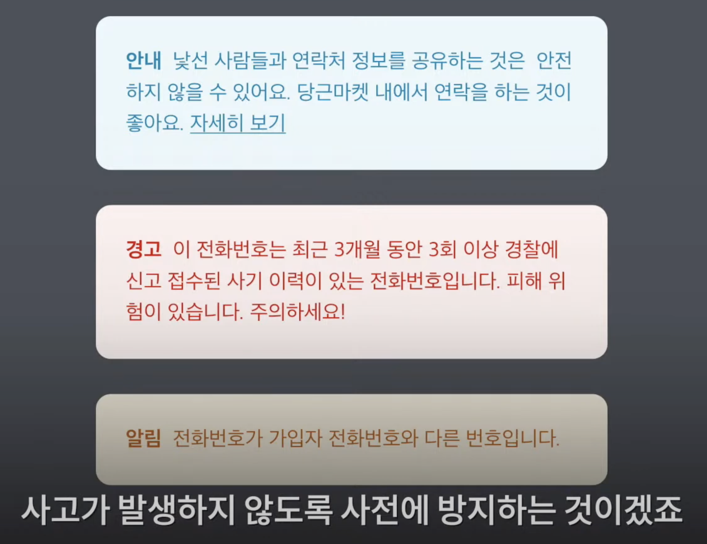 무엇보다도 중고 거래의 특징이자 치명적인 위험성은 아무래도 사기인데, 이러한 사건 사고가 발생하지 않도록 철저하고 안전하게, 그리고 사전에 방지하는 것이 최우선인 것을 모티브로 삼고 있다고 합니다. 실제 거래하고 있는 채팅방에서 안전하게 거래가 이루어질 수 있도록 시스템 안내 메시지를 발송하고 있다고 합니다.