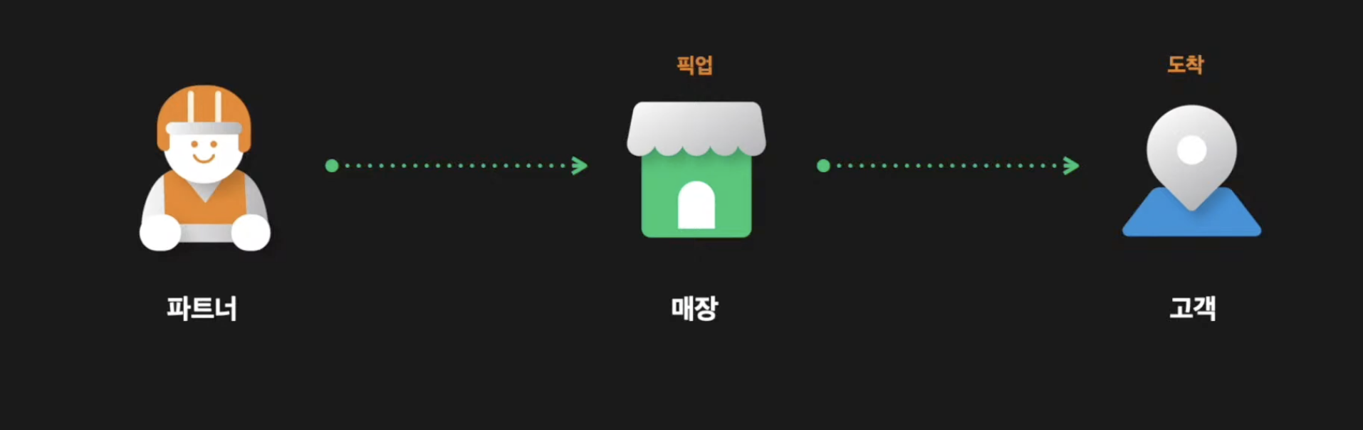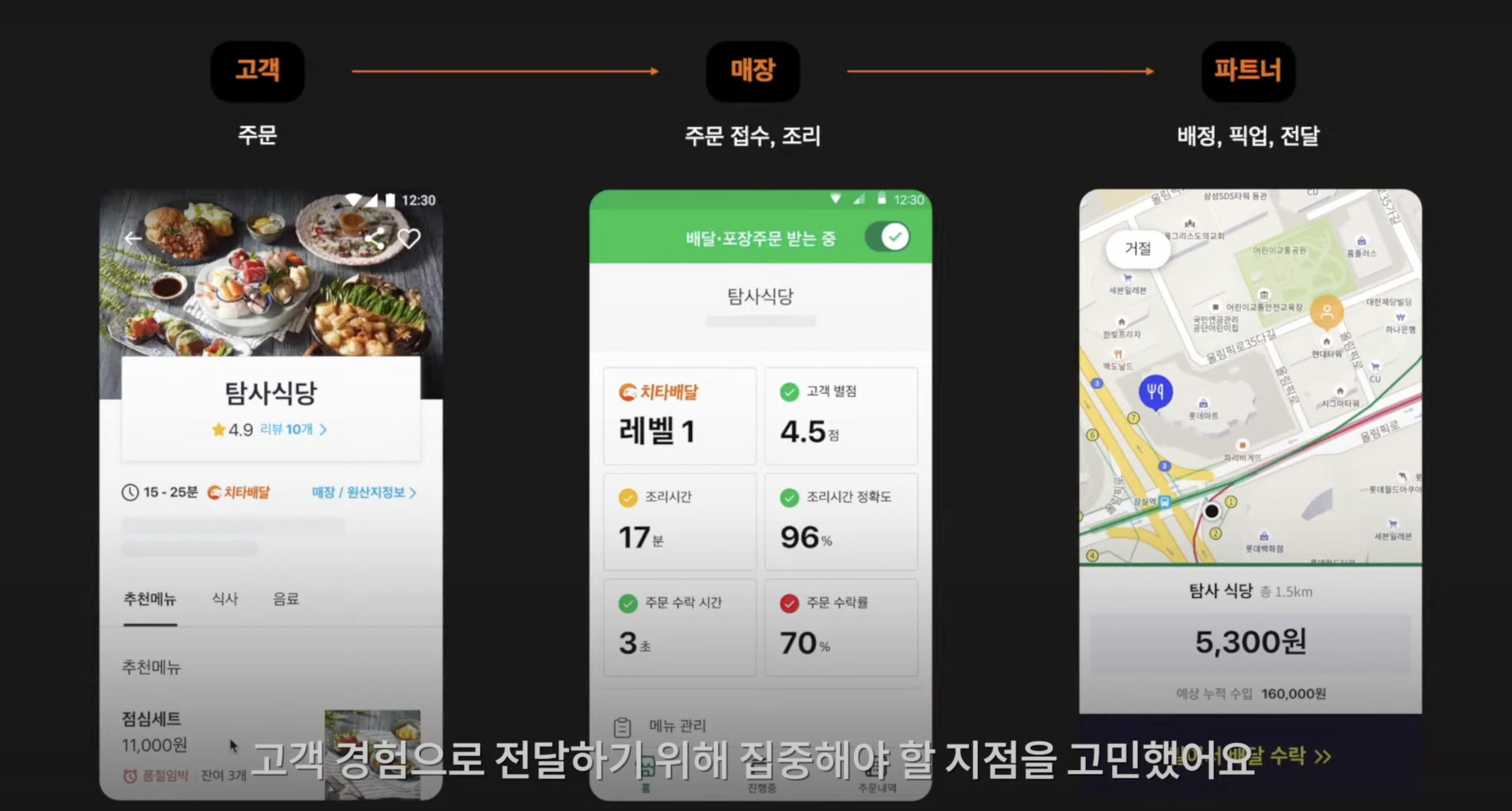 식은 치킨을 받지 않기 위해 주문하자마자 한집만 배달을 가는 쿠팡이츠의 마케팅 전략은 바로 고객 경험이었습니다. 위의 사진처럼 고객이 주문을 하고 매장에서 주문 접수, 조리를 한 후 배달원이라고 하는 파트너가 배달 목적지까지 안전하게 배정, 픽업, 전달을 거치는 과정에서의 이슈를 최소화하고 문제가 없도록 시스템을 구현하기 위해 고객의 소리를 많이 들었다는 것이 쿠팡이츠의 핵심이었다고 합니다.
