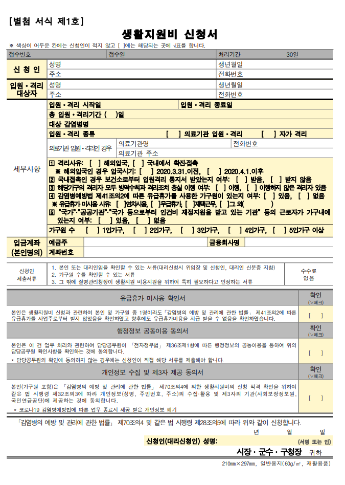 저는 재택 근무가 가능한 상태이기 때문에 사업주에게 주는 휴가비용이 아닌 개인적으로 생활지원금을 신청해야 하는 상황입니다. 아래에 그림에는 충청남도 서천으로 나와있지만 사실 전국구에 해당하는 내용입니다.