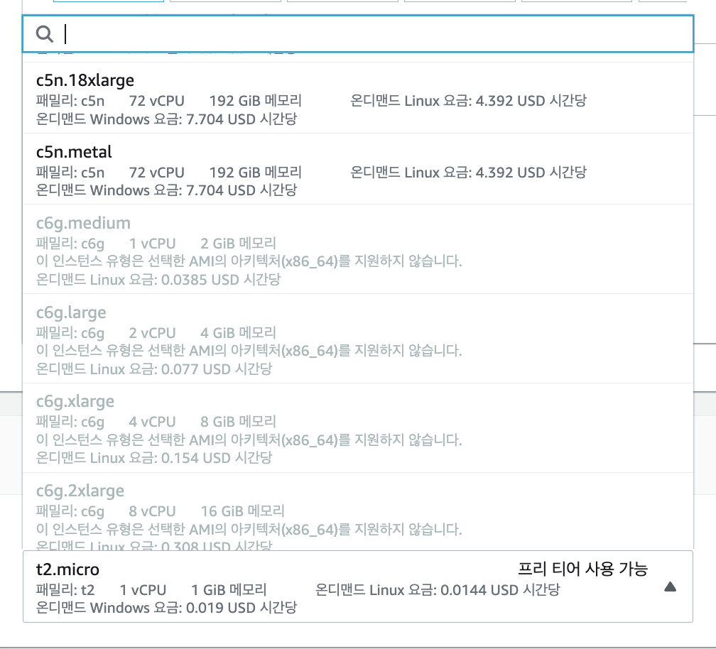 아키텍쳐는 Arm을 선택하였는데요, 요새 한창 핫한 M1 프로세서와 마찬가지의 라인업이라고 보시면 됩니다. 이전에 운영서버에서 사용해왔던 아키텍처인데, 같은 인스턴스 스펙 대비 비용은 11% 절감되었고 성능은 20% 정도 향상되었다고 생각이 들더라구요. 이건 좀 혁신이었습니다. 이 녀석을 선택하면 아래에 인스턴스 유형을 선택할 수 있는 범주가 달라지게 됩니다.