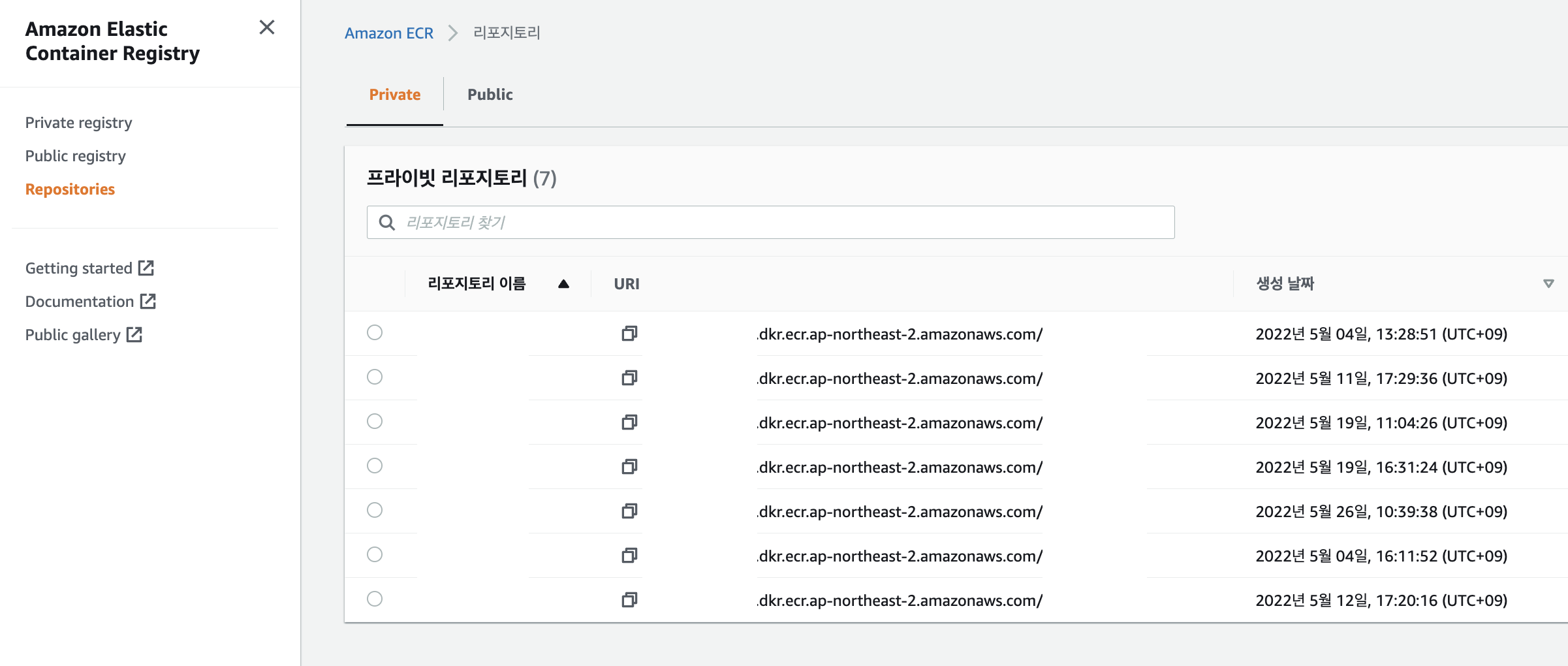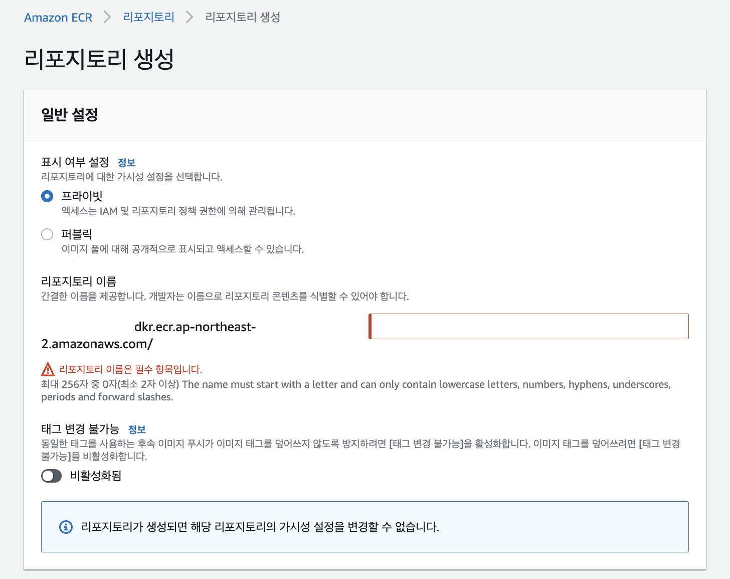 리포지토리를 생성하면 아래와 같이 ECR URL 이 뜨게되고 여기에서 IAM에 등록한 액세스 키로 접근하기 위한 private 리포지토리로 생성해줍니다.