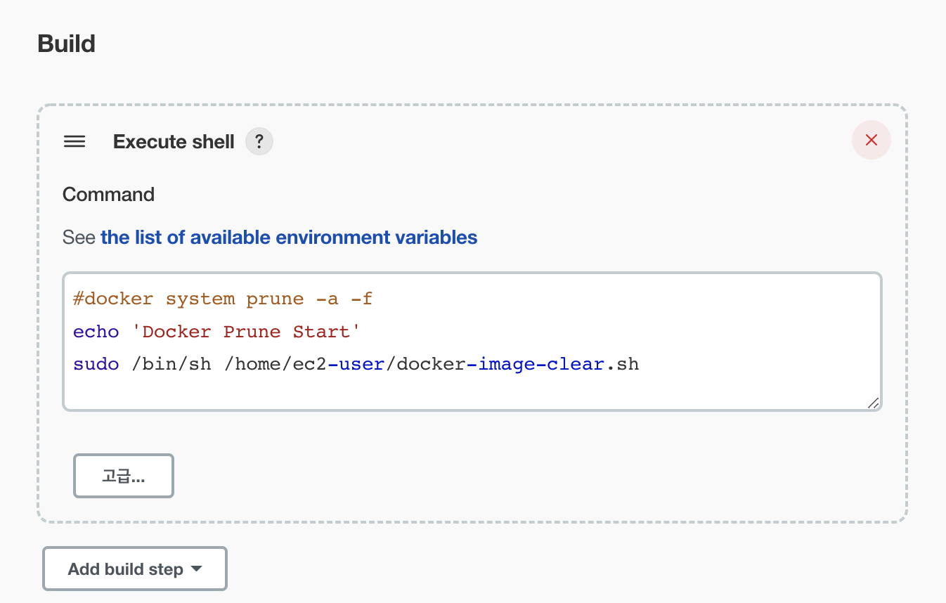 다음으로 스케줄을 실행할 명령어를 작성해주는 구간입니다. 저의 경우 Docker Image를 삭제할 수 있는 스크립트를 해당 경로에 작성하여 스크립트 파일 실행을 하려고 합니다.