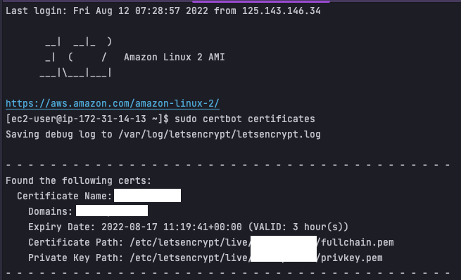 자동 갱신은 아래의 명령어를 사용하시면 됩니다. crontab 이라는 서비스를 사용할 것인데 이는 서버 내 크론식을 설정하여 스케줄링시키는 명령어입니다. 먼저 조회부터 살펴보면 이와 같습니다.