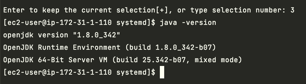 3 java-1.8.0-openjdk.aarch64 (/usr/lib/jvm/java-1.8.0-openjdk-1.8.0.342.b07-1.amzn2.0.1.aarch64/jre/bin/java)