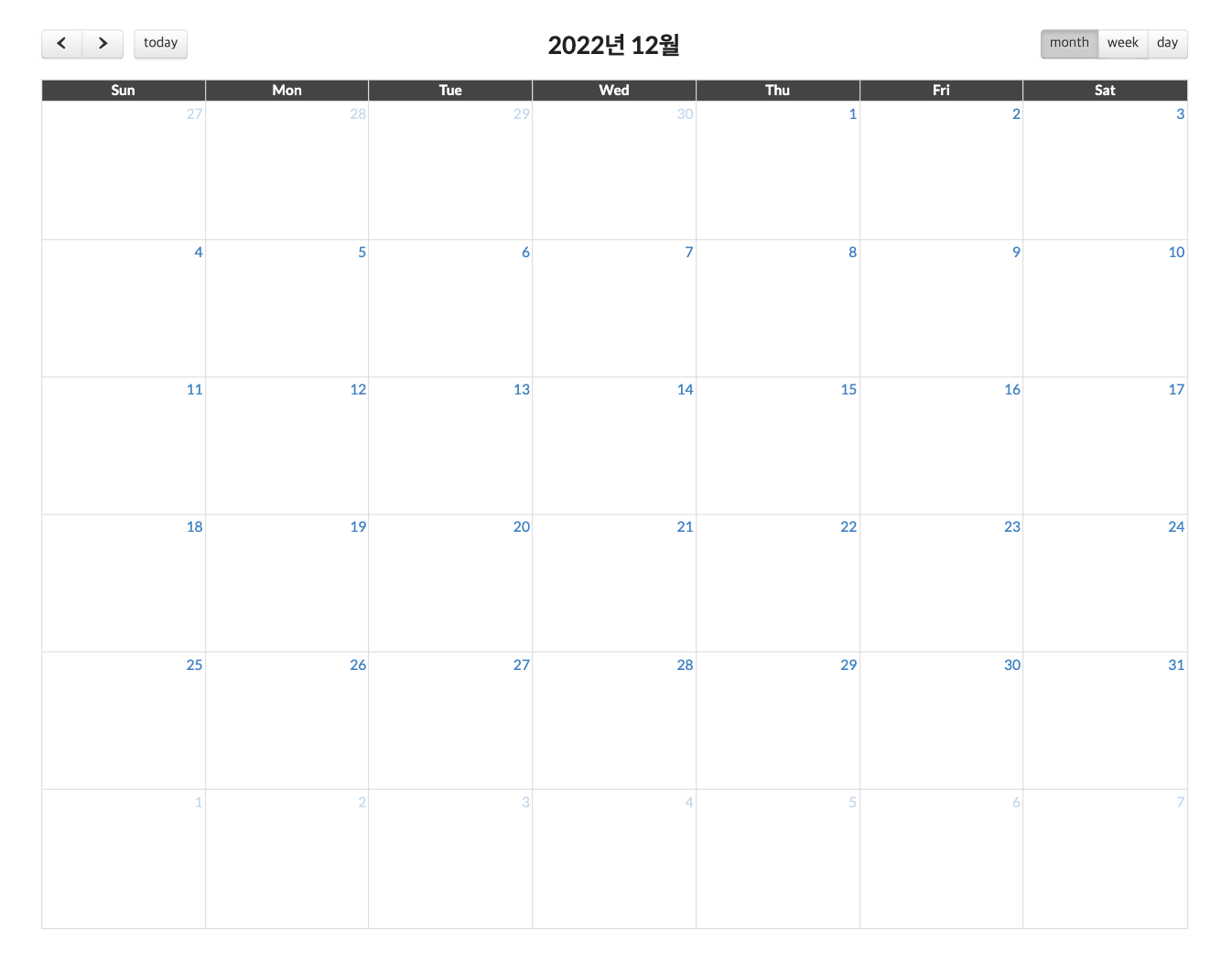 가장 먼저 기능적으로 찾고자 할 때 Github 를 많이 찾아보지 않는 제 기준에서는 스택오버플로우나 구글링을 위주로 진행하고 있어서 달력을 렌더링 하는데 어려움이 있었습니다. 그래서 달력의 타이틀을 지정하거나(아래 사진에서 2022년 12월)이나 옆의 month,week,day 등과 같은 버튼 이벤트를 따로 만들어주는 줄 알았습니다.
