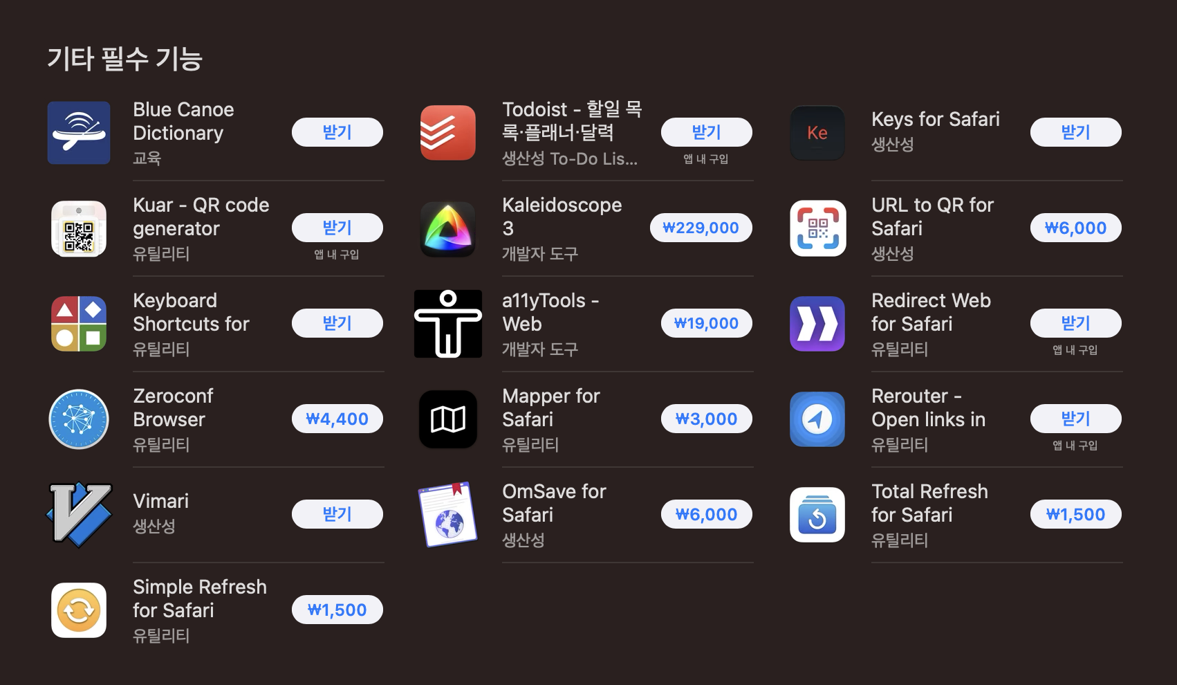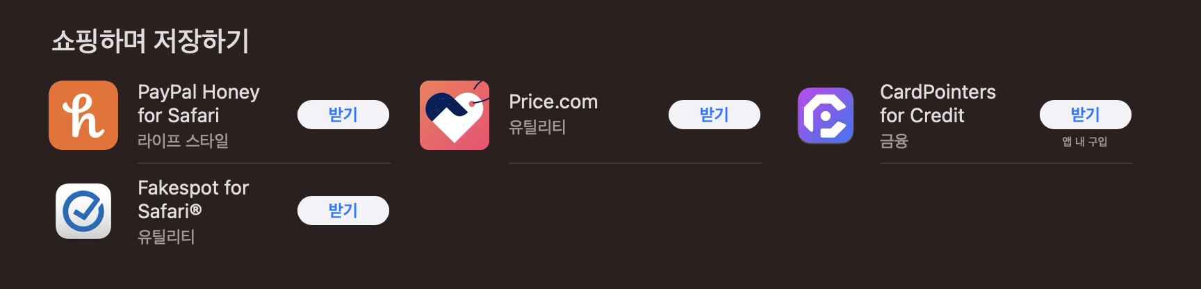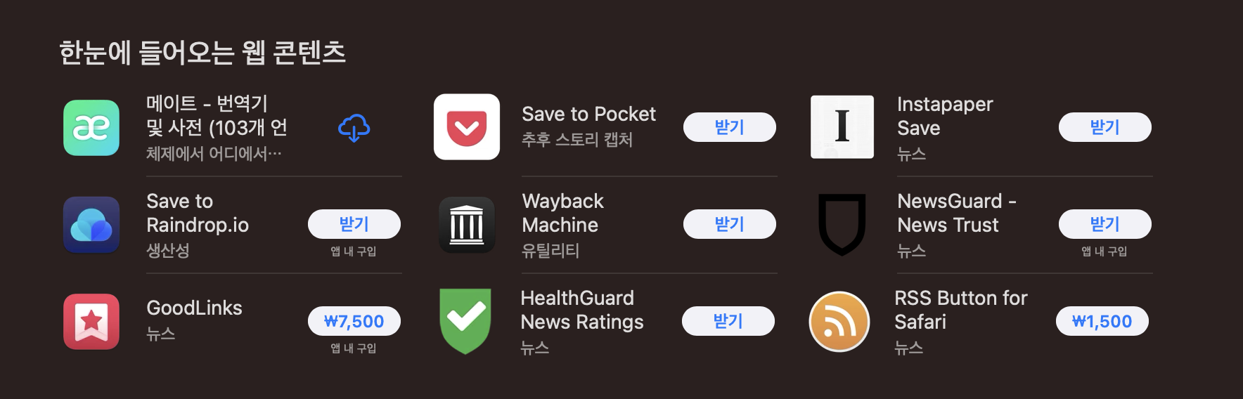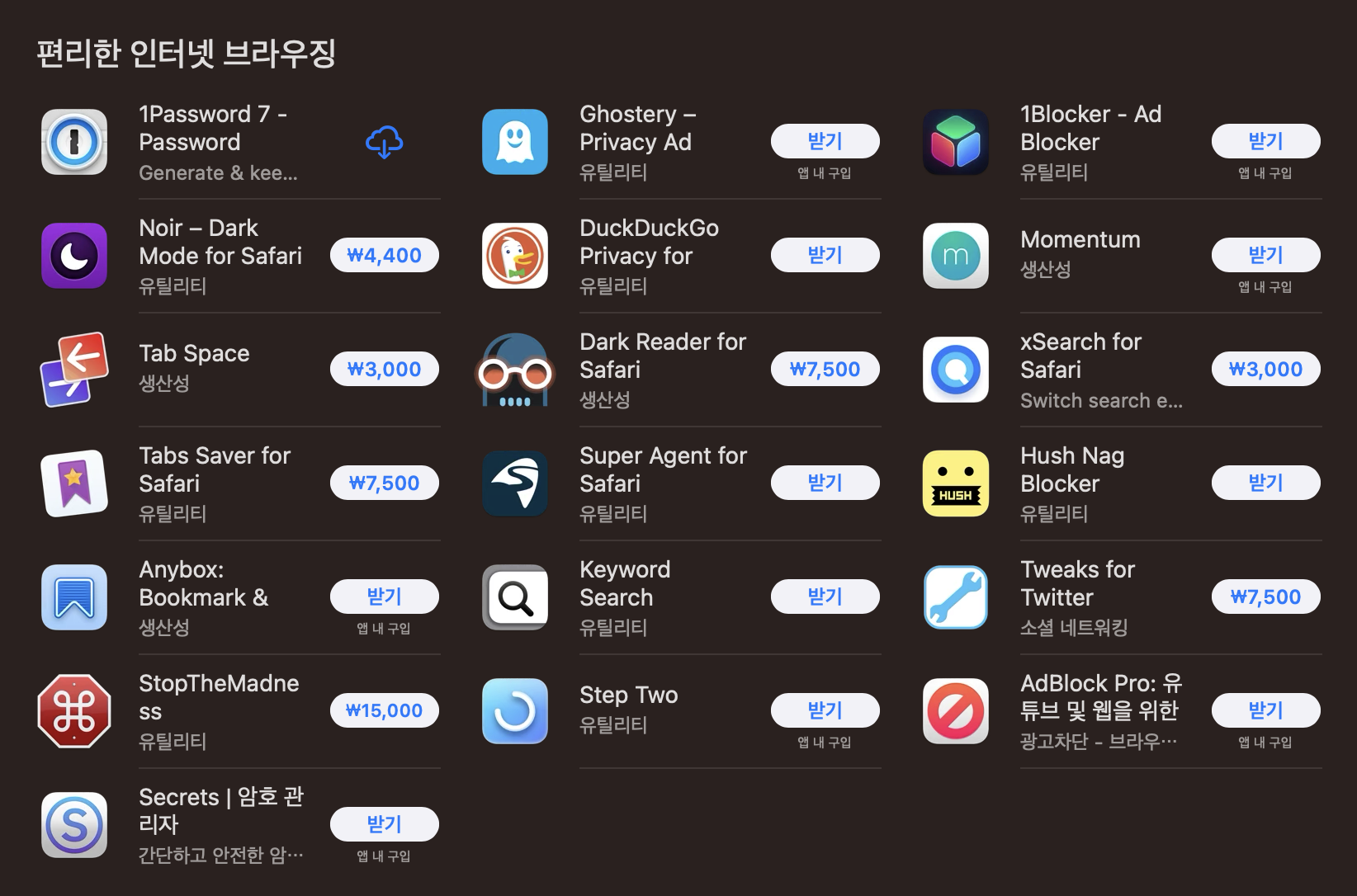 안녕하세요~ 오늘은 Apple 에서 기본적으로 제공하는 사파리 웹 브라우저에 추천할만한 리스트를 가지고 왔습니다. 가장 먼저 해당 프로그램은 앱 스토어에서 설치할 수 있고, 맥의 사파리 브라우저에서 원활하게 돌아갈 수 있습니다. 리스트는 아래와 같습니다.
