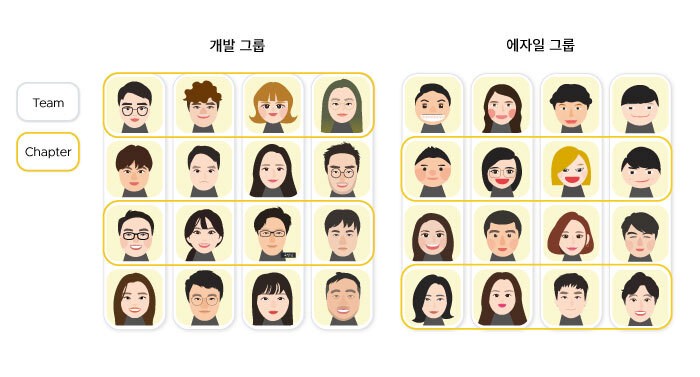 - 에자일 팀: 각 에자일 팀에는 주어진 Metric을 개선하기 위해 각 챕터원들이 모여 하나의 에자일 팀이 만들어지고 운영 인원들이 함께 포함되어 서비스를 개선하는 사명을 가진 팀입니다.