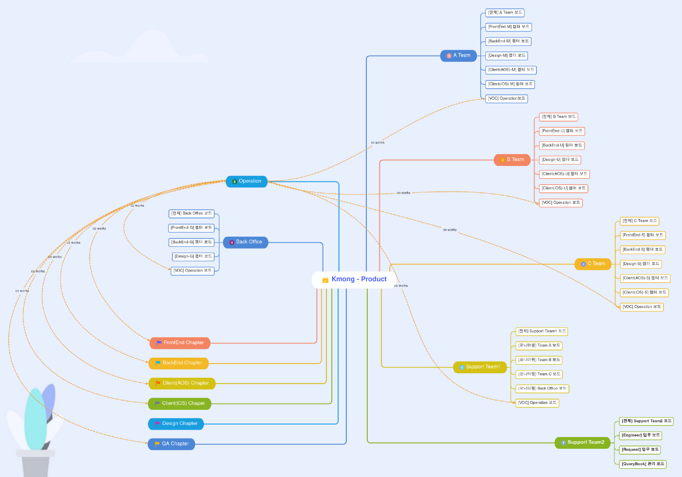 마인드맵에서 추가적으로 확인 가능한 정보는 Operation Team에서 생성하는 VOC 이슈에 대한 각 Team 별, Chapter 별 업무에 대한 Co-work 노드를 확인할 수 있습니다.