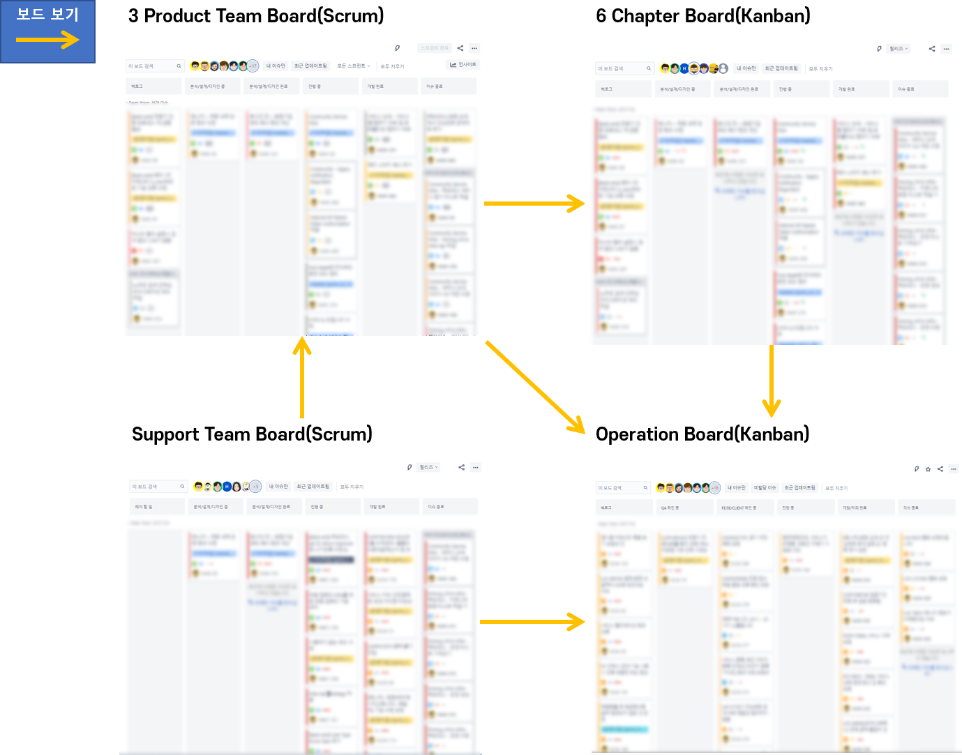 챕터 보드는 백로그에 올라온 이슈를 처리하거나 각 에자일팀에서 진행 중인 내용을 공유할 수 있도록 칸반 보드로 이용 중입니다.