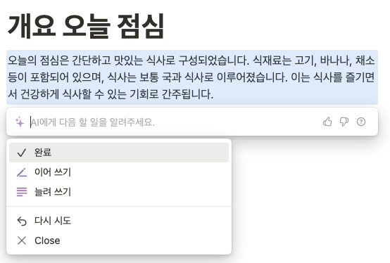 이제 글을 다 작성한 Notion AI 가 선택지를 내보냈습니다. 저는 이 글이 길다고 생각하지만, 왠지 이어 쓰기는 위에서 쓴 내용과 유사하지만 다른 내용을 추가로 작성해주는 것 같고, 늘려 쓰기 라는 기능이 궁금하여 늘려 쓰기를 선택해보았습니다. 늘려 쓰기는 말 그대로 위에서 Notion AI 가 쓴 글을 더 장황하게 늘여서 보여주는 것 같았습니다.