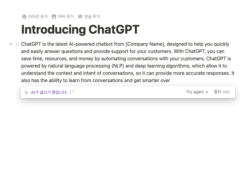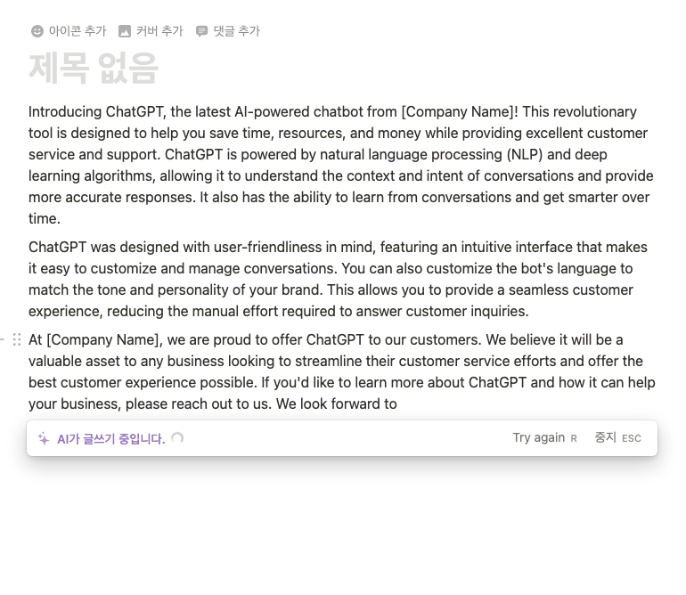 이제 AI가 글쓰기 중이라며 글을 계속 써내려갑니다. 근데 대괄호에 들어간 내용은 조금 알 수 없네요.. 제가 알기론 ChatGPT 는 마이크로소프트에서 인수한 특정 회사인 것으로 알고 있는데, 아직 그 정보는 Notion AI 의 빅데이터 흐름에 들어갔는지 안들어갔는지 잘 모르겠지만 [Company Name] 으로 출력이 되고 있네요. 그나저나 글을 자동으로 써주는 것은 정말 신기합니다.