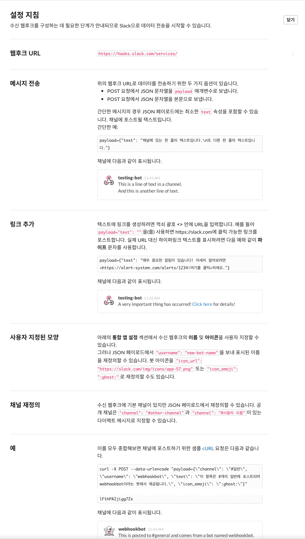 curl -X POST --data-urlencode "payload={\"channel\": \"#일반\", \"username\": \"webhookbot\", \"text\": \"이 항목은 #개의 일반에 포스트되며 webhookbot이라는 봇에서 제공됩니다.\", \"icon_emoji\": \":ghost:\"}" ${웹훅으로_생성된_URL}