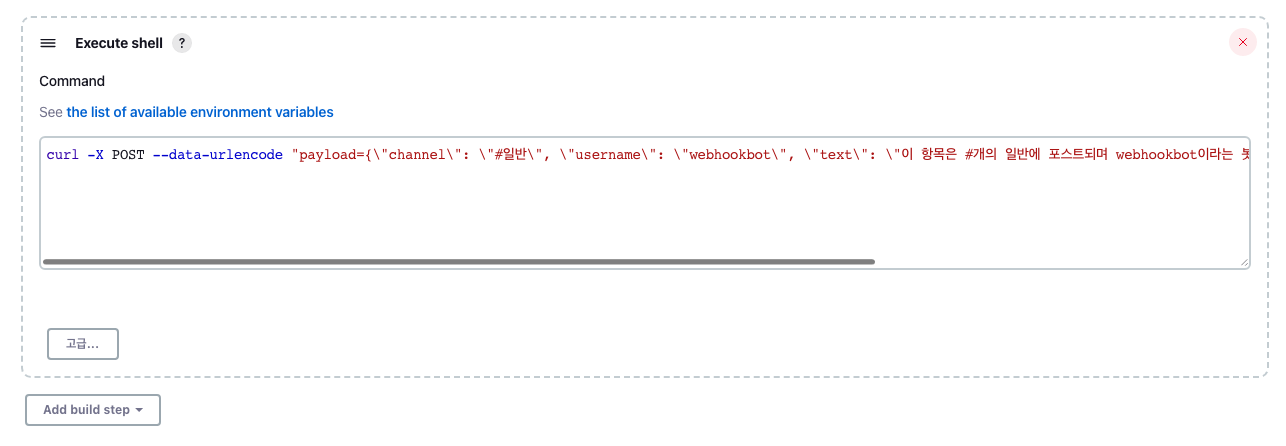 이제 위의 명령어 (아까 웹훅 설정에서 기본적으로 만들어준 curl 명령어)를 빈칸에 입력하고 저장을 누릅니다.
