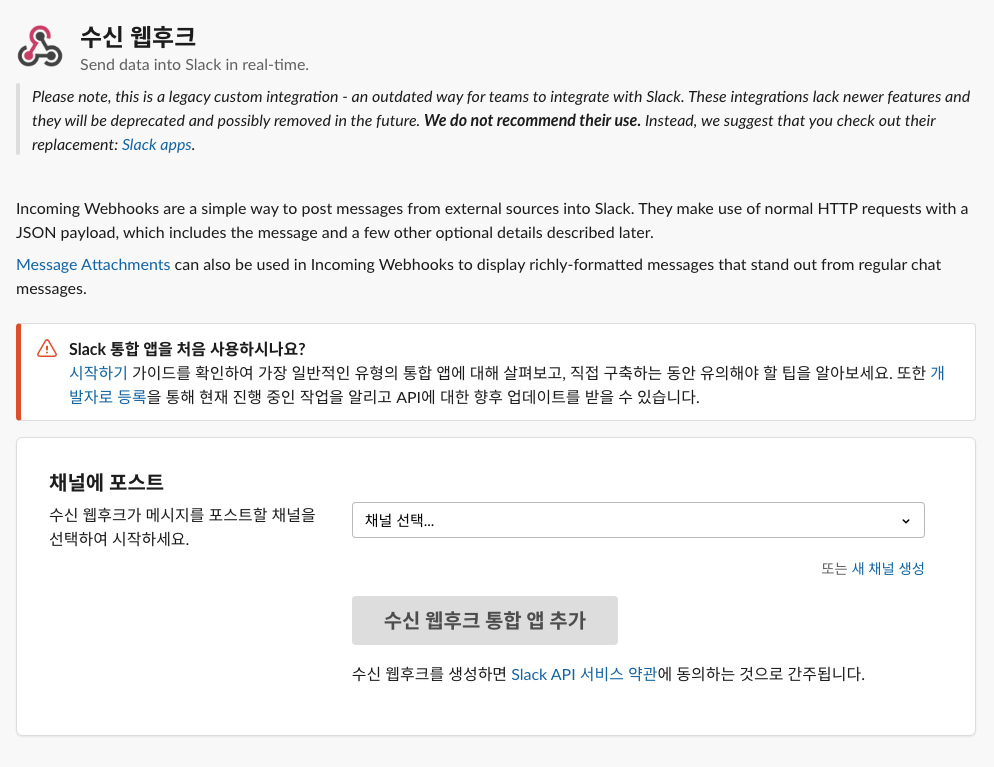 가장 먼저 적용할 부분은 Slack 웹훅을 보낼 수 있는 페이지에 접속하여 보내고자 할 워크스페이스에 연동하는 작업입니다. 전송하고자 하는 채널을 선택하시고, 없는 경우 새 채널 생서응로 해서 채널을 만들어주면 준비는 끝납니다.