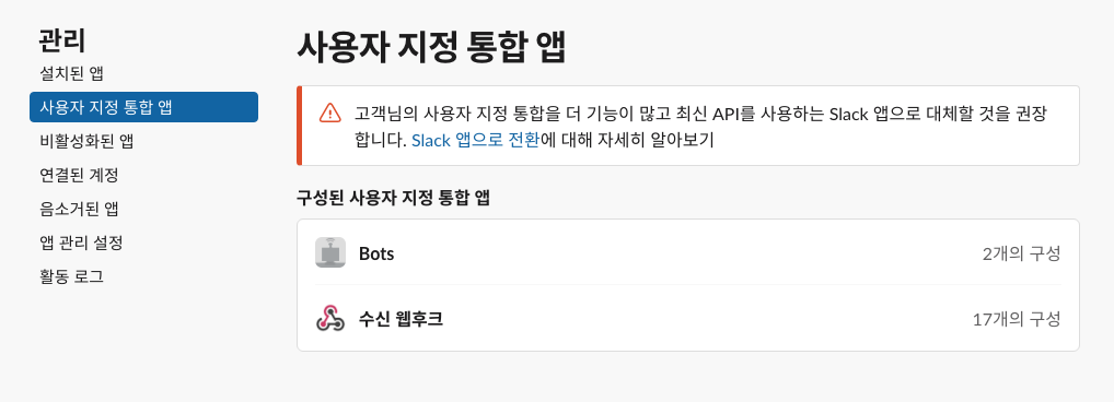 아래의 페이지가 나올 때 까지 접속합니다. 관리 - 사용자 지정 통합 앱 - 수신 웹후크 로 들어갑니다.
