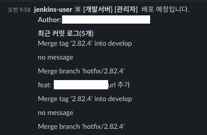 저 같은 경우는 jenkins-user 를 웹훅 봇의 이름으로 지정하였고, 커밋 로그를 5개까지 뿌려줄 수 있도록 지정하였습니다. 이제 앞으로 배포 때마다 일일히 타이핑 치지 않고도 어떤 내용이 어느 서버에 들어가는지 손쉽게 확인할 수 있게 되었습니다 :)