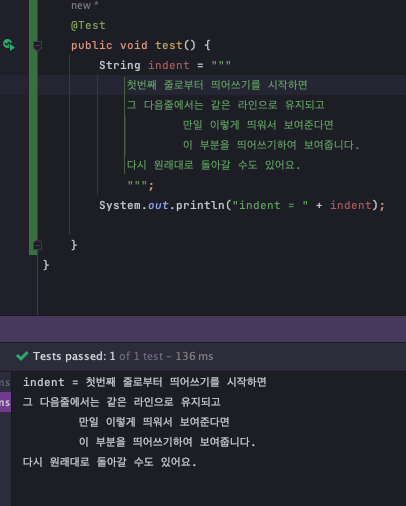 띄어쓰기 문법도 기존의 String 과 유사하게 적용됩니다.