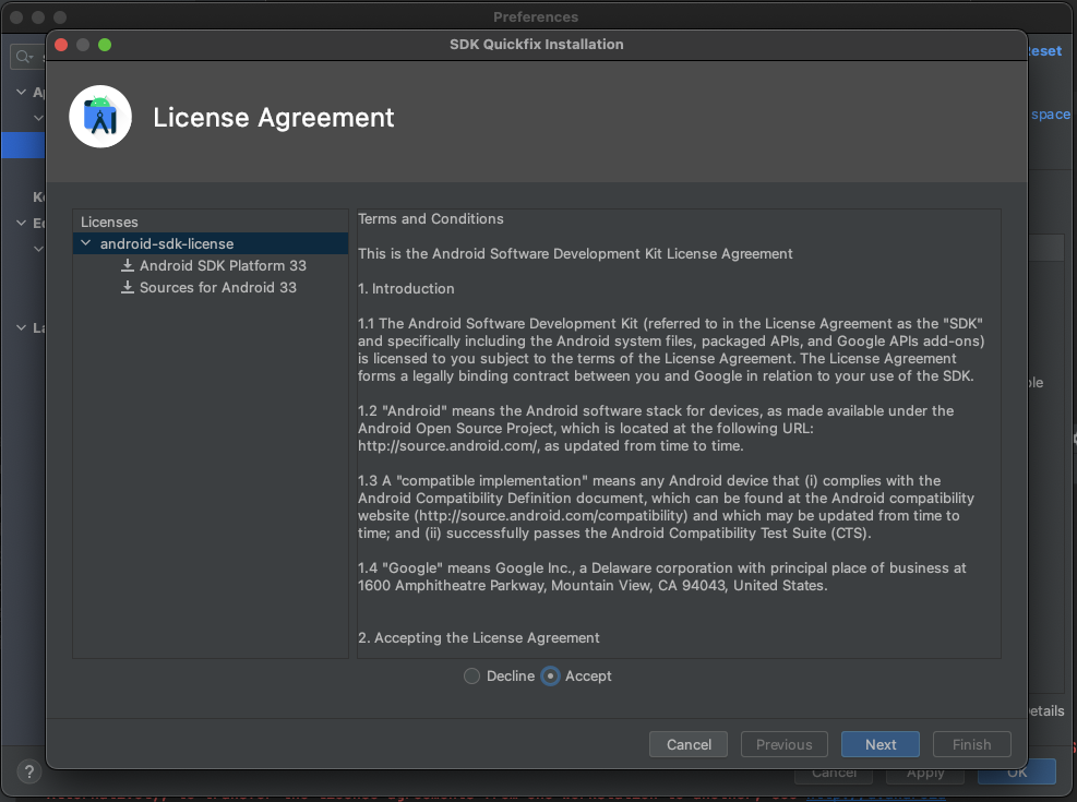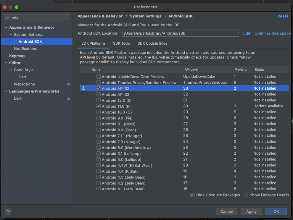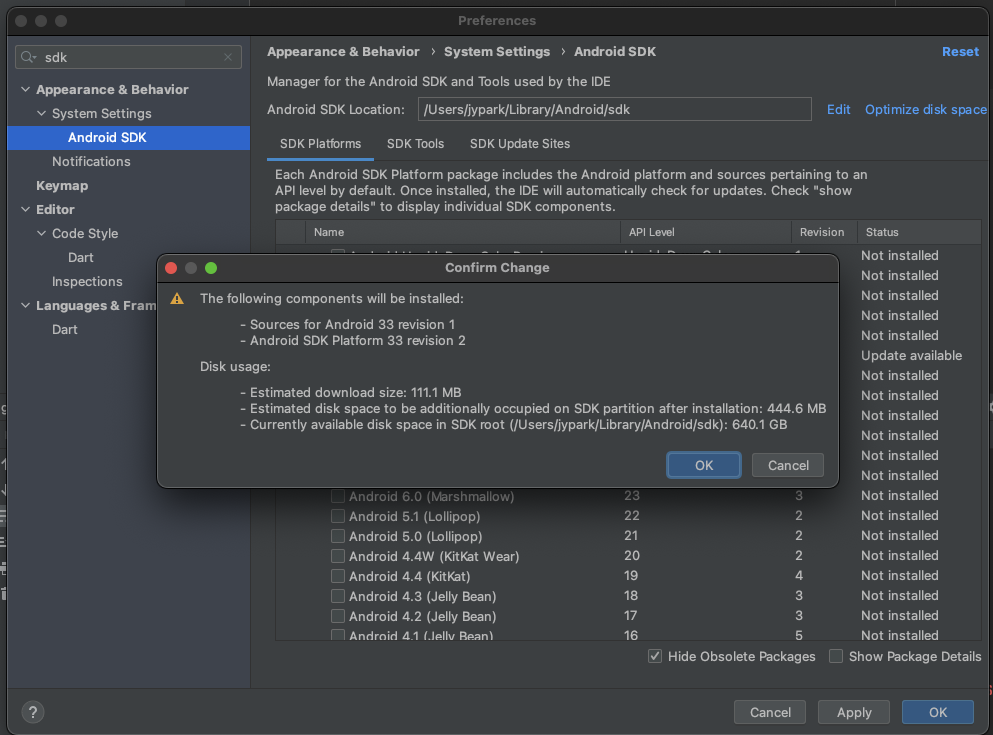 에러 로그를 보면 아시겠지만 Android SDK Platform 33 이 설치가 안되어있다고 에뮬레이터로 실행이 불가능하다는 메시지가 보였습니다. 그렇기 때문에 안드로이드 SDK를 설치하기 위해 아래와 같이 화면에 들어가서 설치를 합니다. 설치는 다운로드버튼이 활성화되면 체크를 한 후 OK 를 누르면 다운로드가 시작되기 전에 약관 동의를 묻습니다.