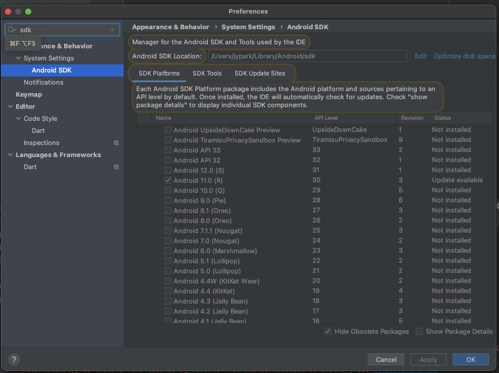 1. Cmd + , 을 눌러 세팅에 들어간 후 SDK 로 검색
