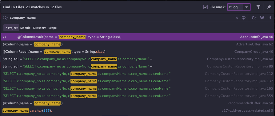 위의 사진은 company_name 라는 내용으로 전체 소스 코드 내에서 찾고 싶은 경우를 조회하여 검색한 결과를 보여줍니다. 하지만 log 파일에서는 찾고싶지 않은 경우가 있습니다.