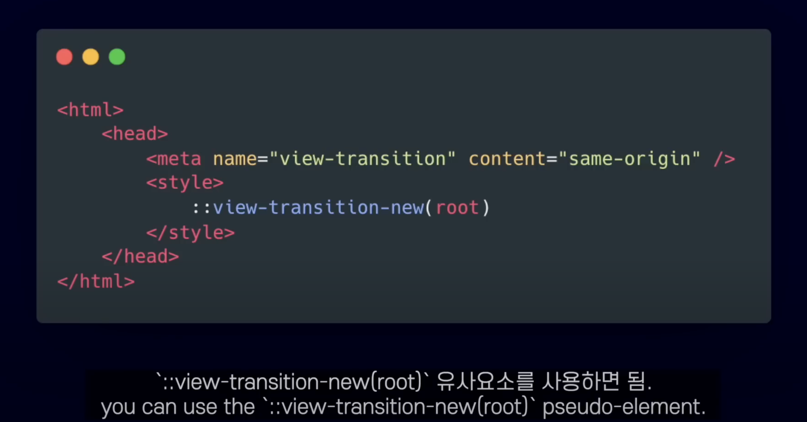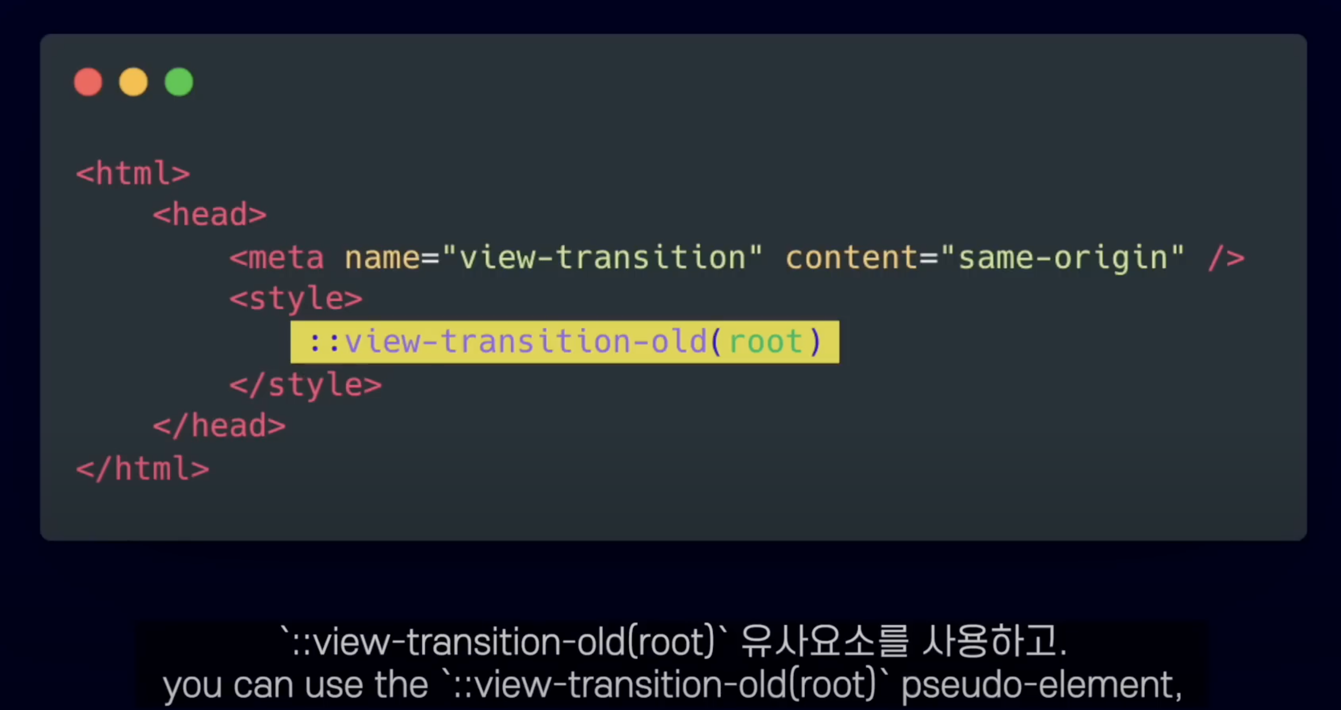 style 태그 내에 ::view-transition-old(root) 를 넣어주고, 아래에는 -new(root) 를 넣어줍니다.