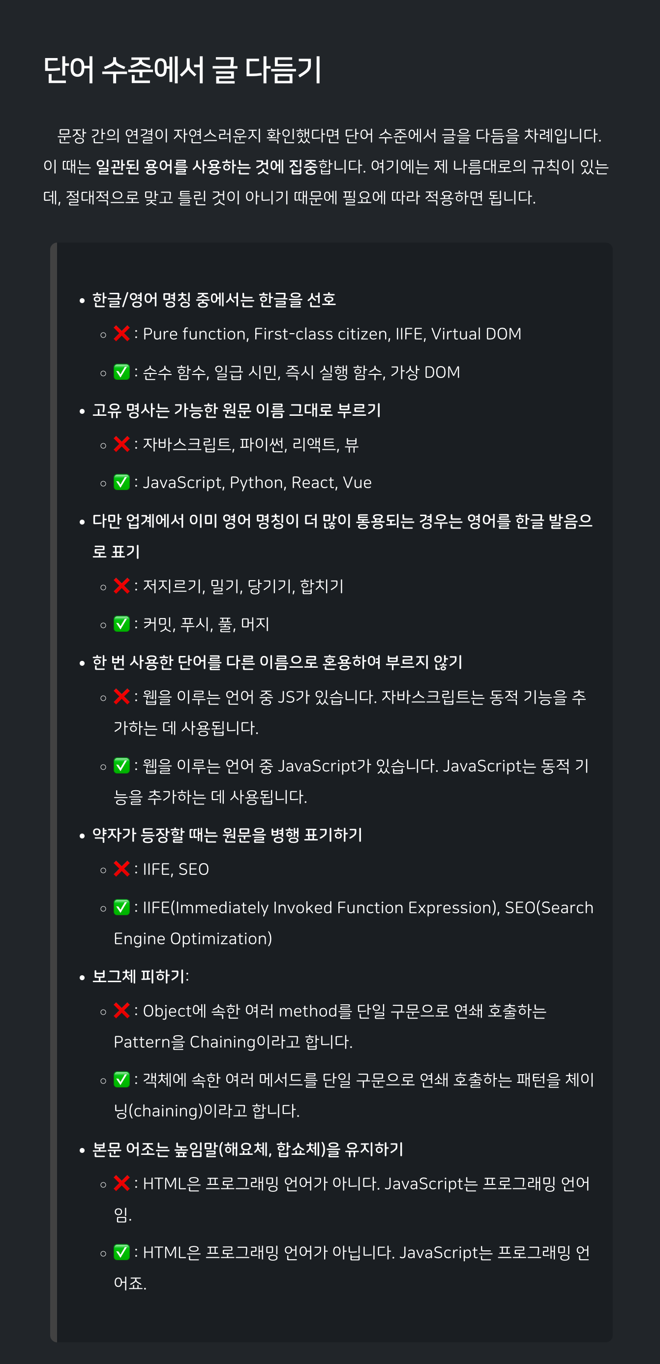 해당 내용에서는 글을 작성하기 전 미리 시간을 마련해야 한다는 점, 작성할 때 유의해야할 점, 내가 작성한 글이 읽히기 쉬워야 하기 위한 방법론들과 쉽게 용어를 풀어서 설명하는 부분을 포함하고 있습니다.