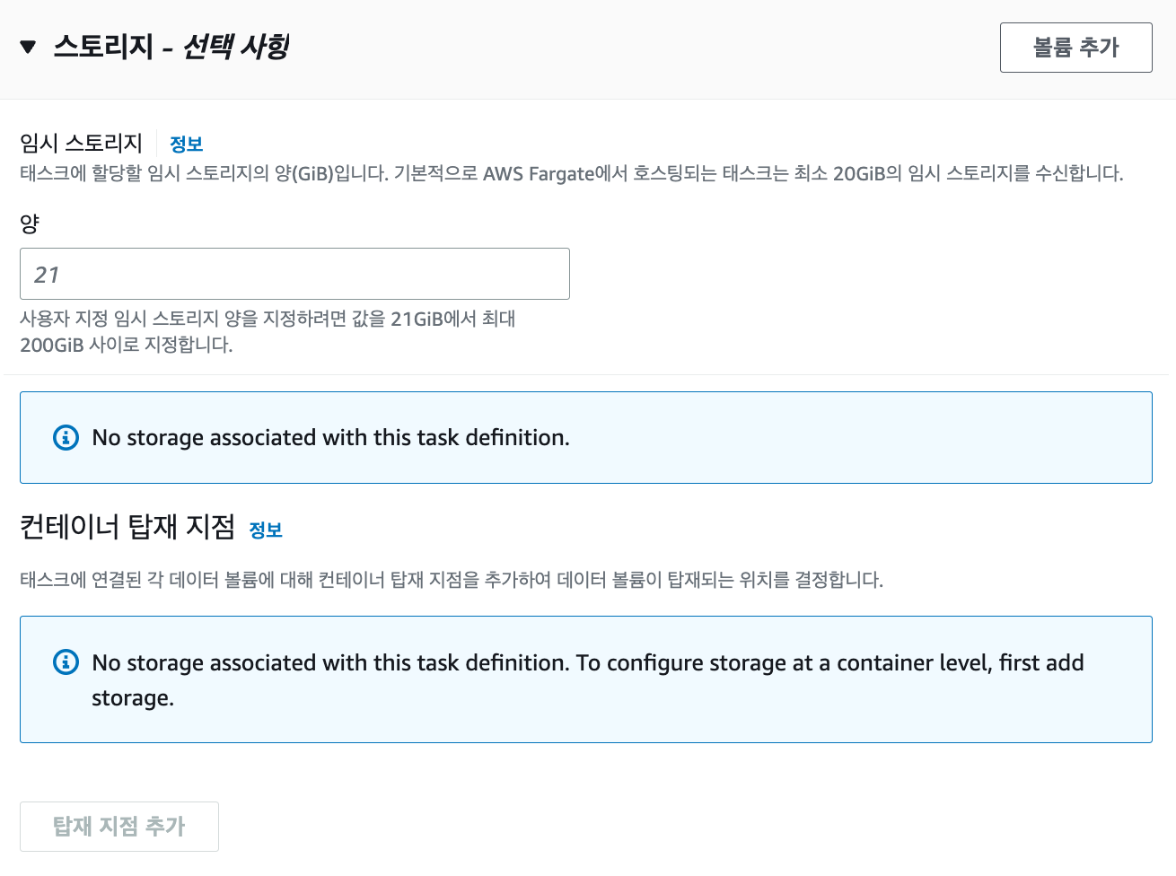 태스크가 할당할 스토리지의 SSD 볼륨입니다. 기본값으로 지정하여도 프로그램이 작동되는데 큰 문제는 없습니다.