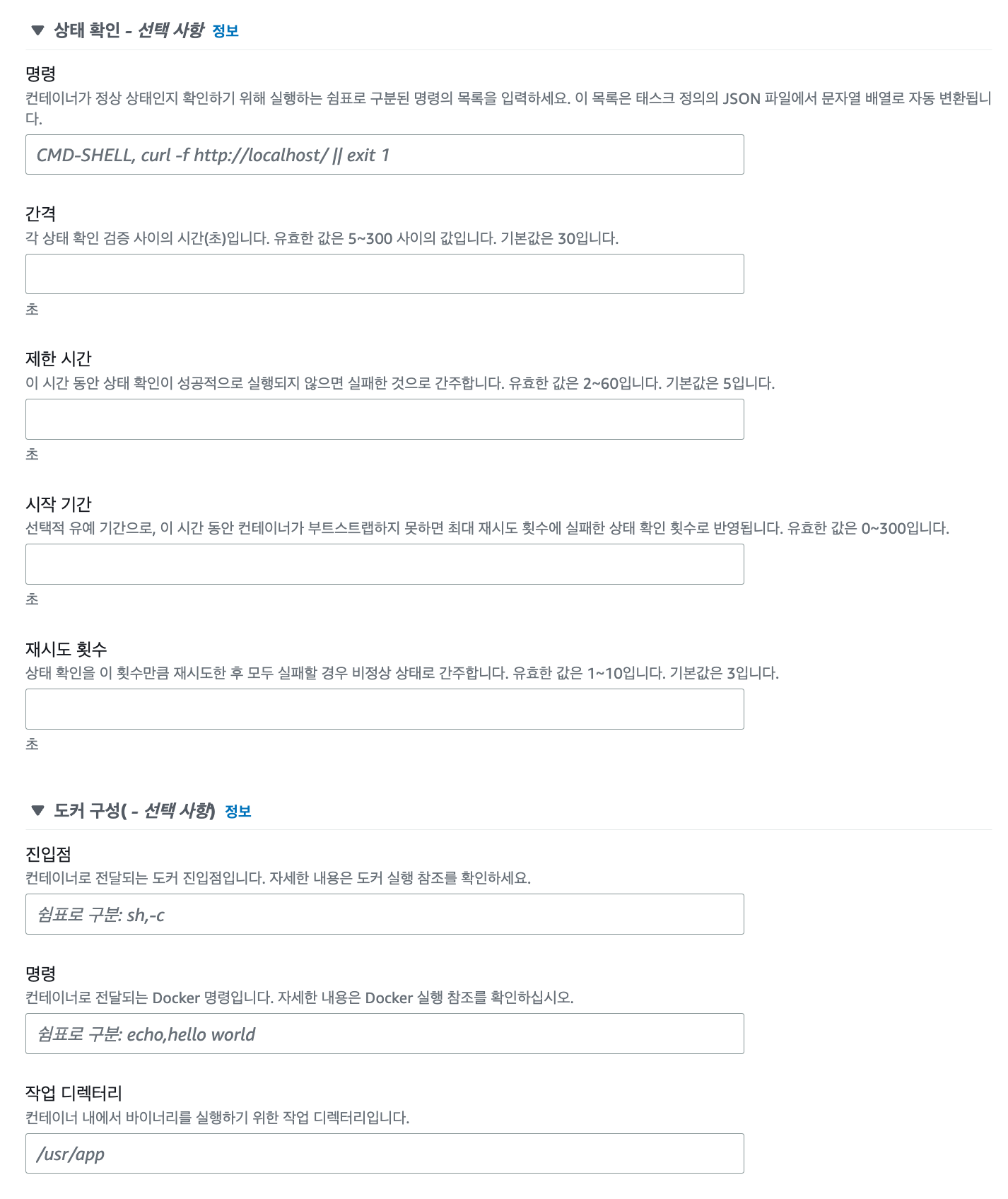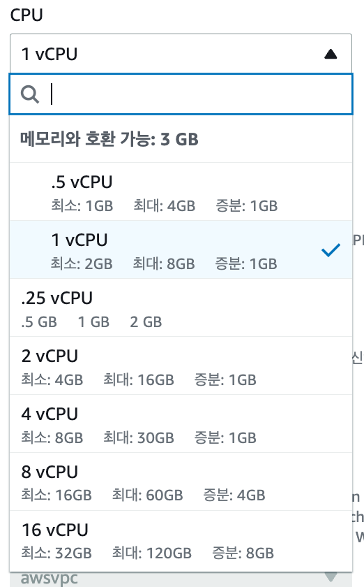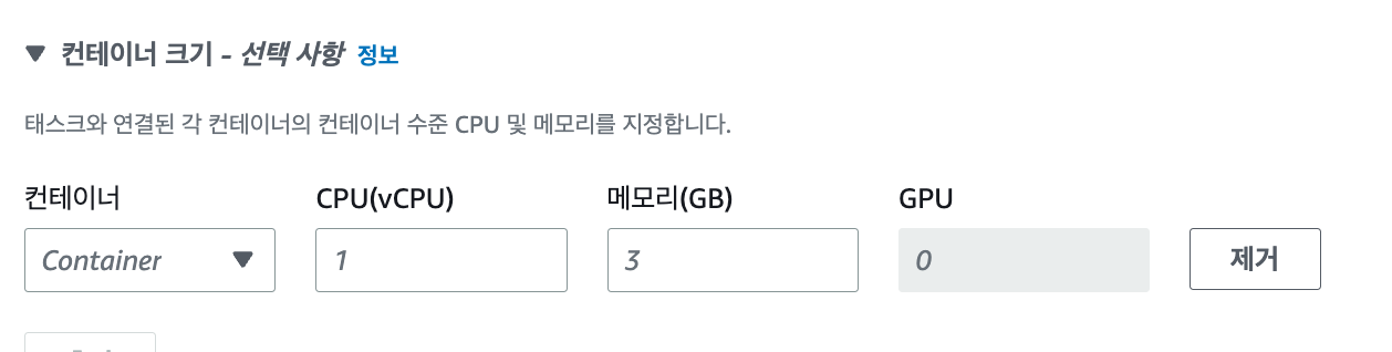 컨테이너 크기는 Docker Image를 관리하는 Docker Container의 크기를 의미합니다. 여기서는 설정을 따로 하지 않아도 태스크 크기에 맞춰 자동으로 지정해줍니다.