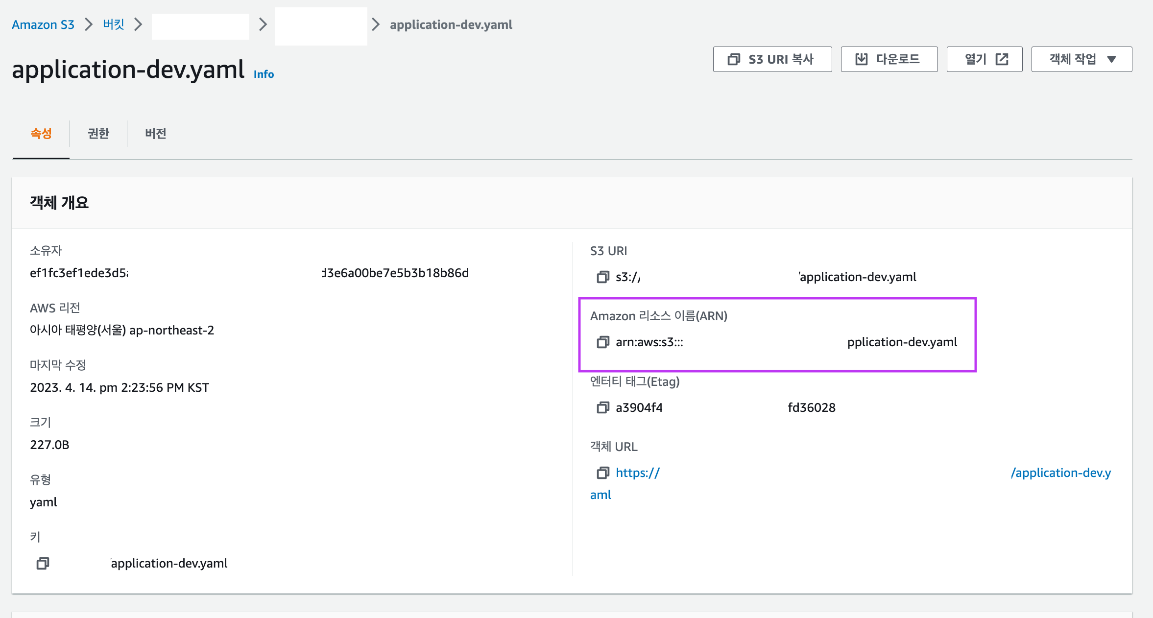 S3 파일의 경우 링크를 넣는 것이 아닌 ARN(Amazon Resource Name) 값을 넣어줍니다.
