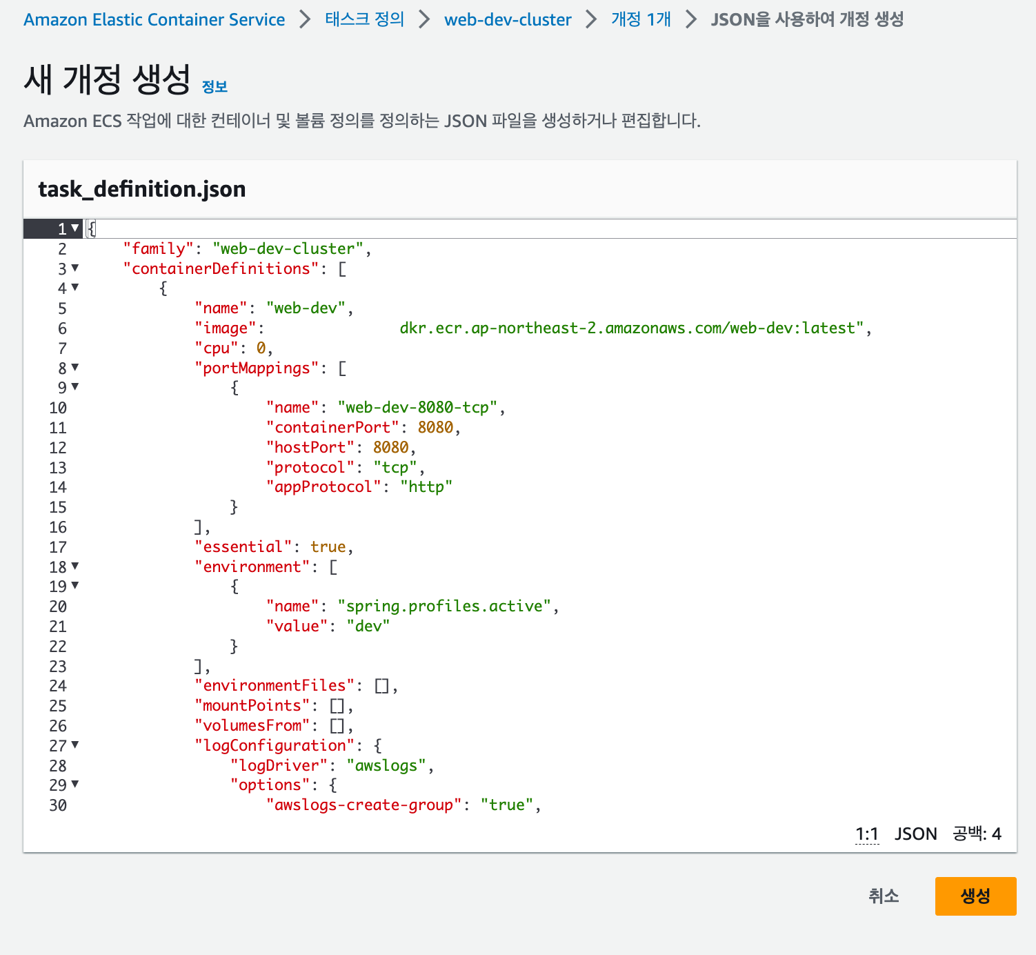 https://ap-northeast-2.console.aws.amazon.com/ecs/v2/task-definitions?region=ap-northeast-2