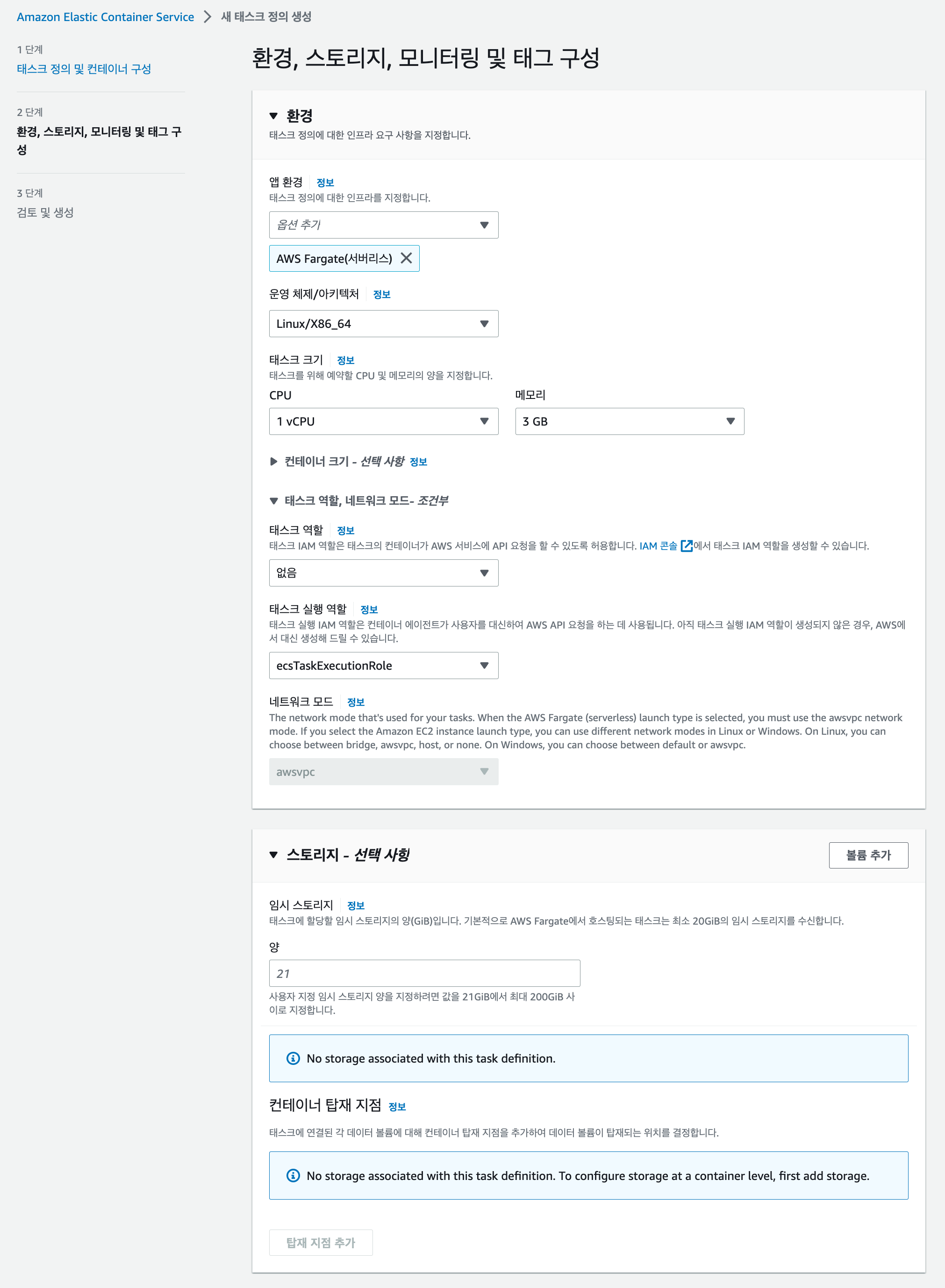 3) 태스크 구성하기 2단계 - 환경, 스토리지, 모니터링 및 태그 구성