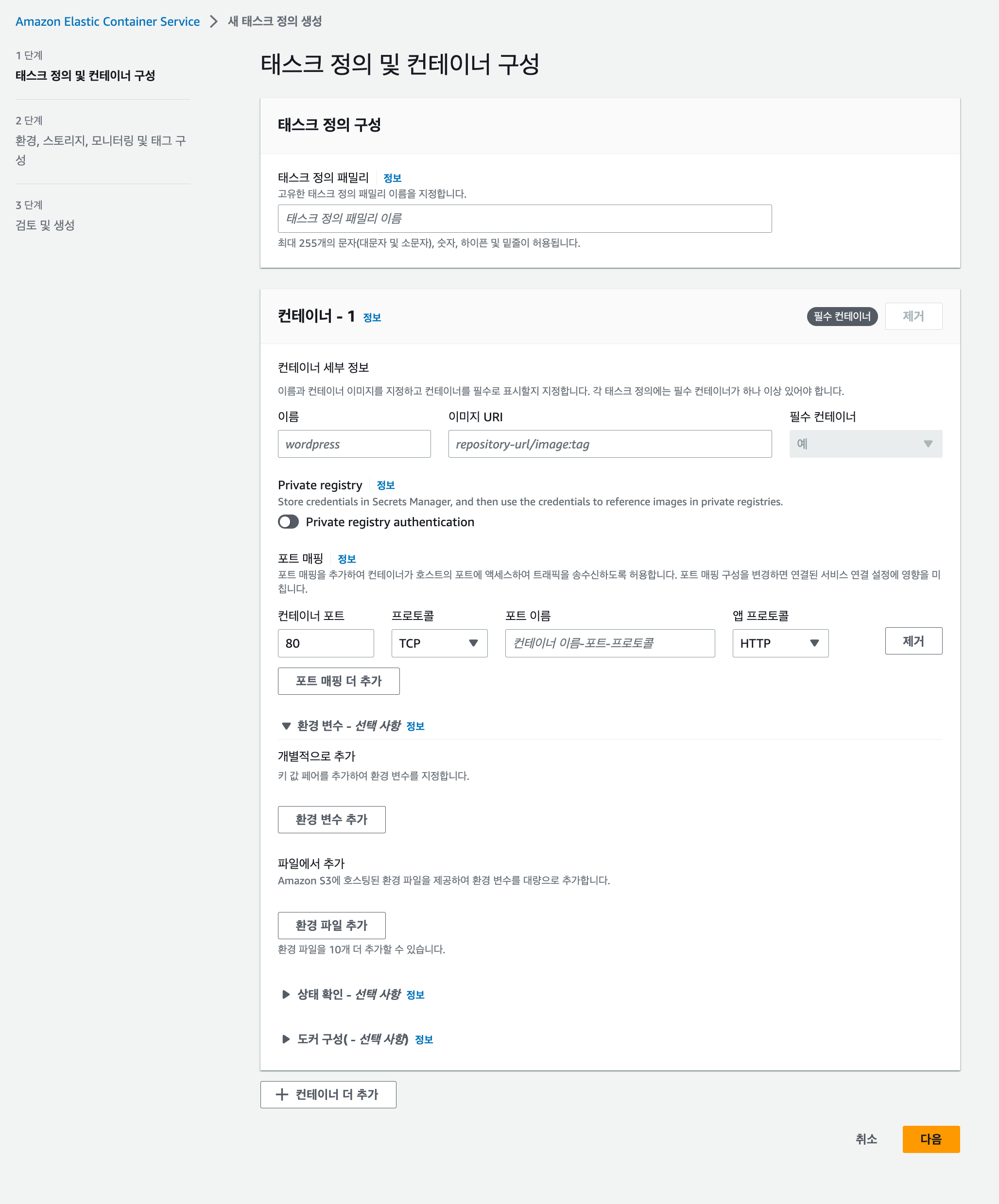2) 태스크 구성하기 1단계 - 태스크 정의 및 컨테이너 구성