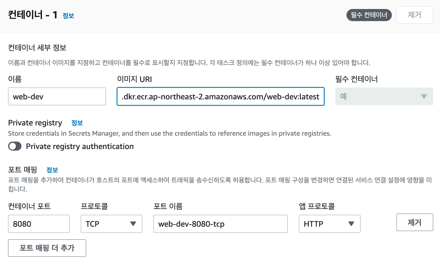 해당 페이지에서는 태스크의 기초 개념인 태스크 정의 패밀리 이름과 ECR 리포지토리에 존재하는 Docker Image URI를 넣어주는 역할을 합니다.