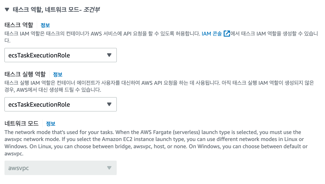 4. 태스크 역할, 네트워크 모드