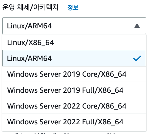 이제 두번째로 확인할 곳입니다. 앱 환경의 경우 AWS Fargate, EC2 중에 선택이 가능합니다. 이번 태스크 생성은 Fargate로 진행하고자 하여 Fargate를 선택하겠습니다.