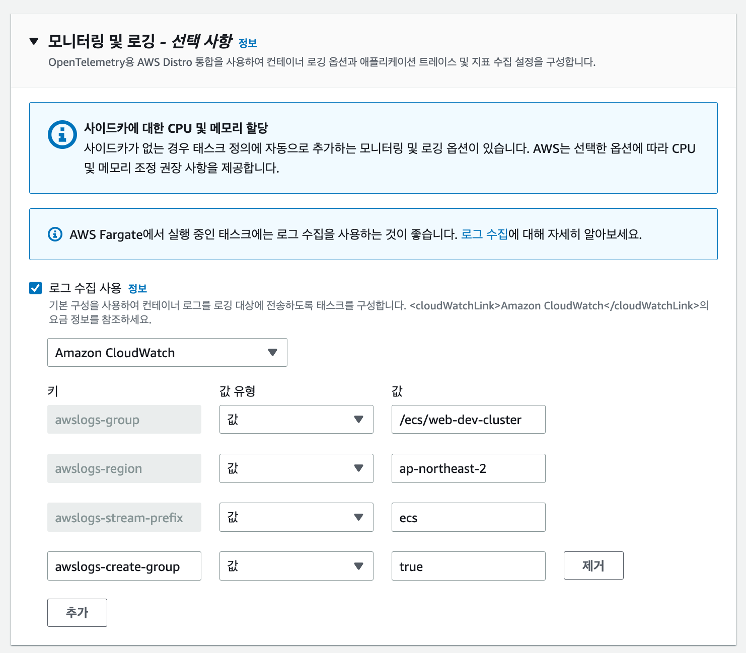 모니터링은 주로 로그를 집계하면서 동시에 이루어집니다. CloudWatch 라는 서비스가 바로 그 기능을 담당하는 서비스이고, 로그를 확인하고자 할 때에도 CloudWatch에서 확인이 가능합니다. 지금 이 글에서는 태스크를 설정하는 것만 먼저 체크해보고, 로그 보는 방법은 다른 글에서 올려보도록 하겠습니다.